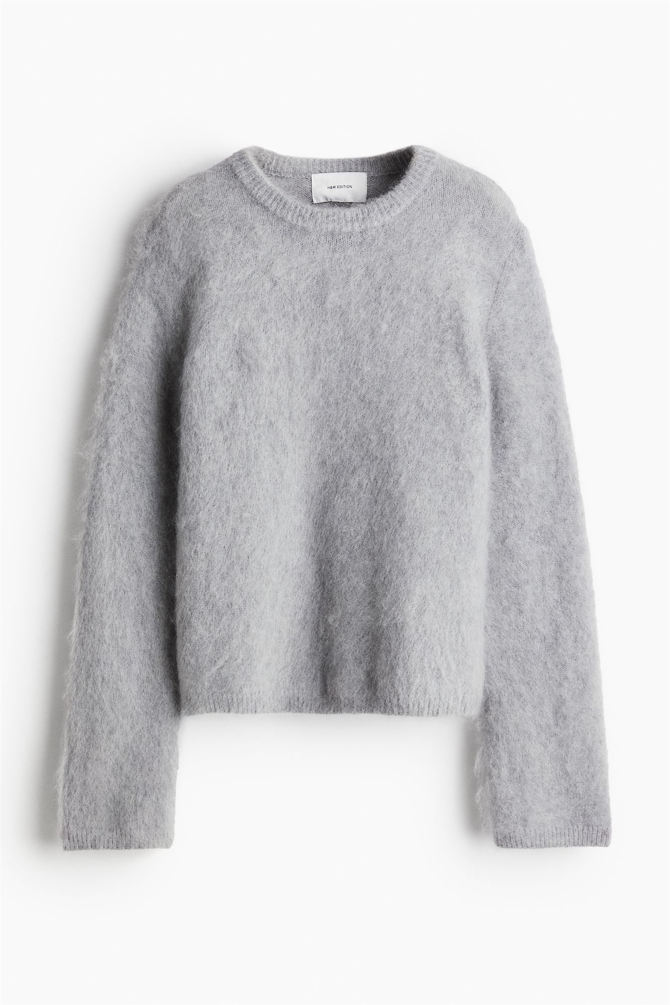 Приталенный джемпер из мягкого трикотажа с содержанием мохера и шерсти. Круглый вырез с ребристой отделкой, спущенные плечи и длинные рукава. Узкий рубчик на манжетах и подоле.