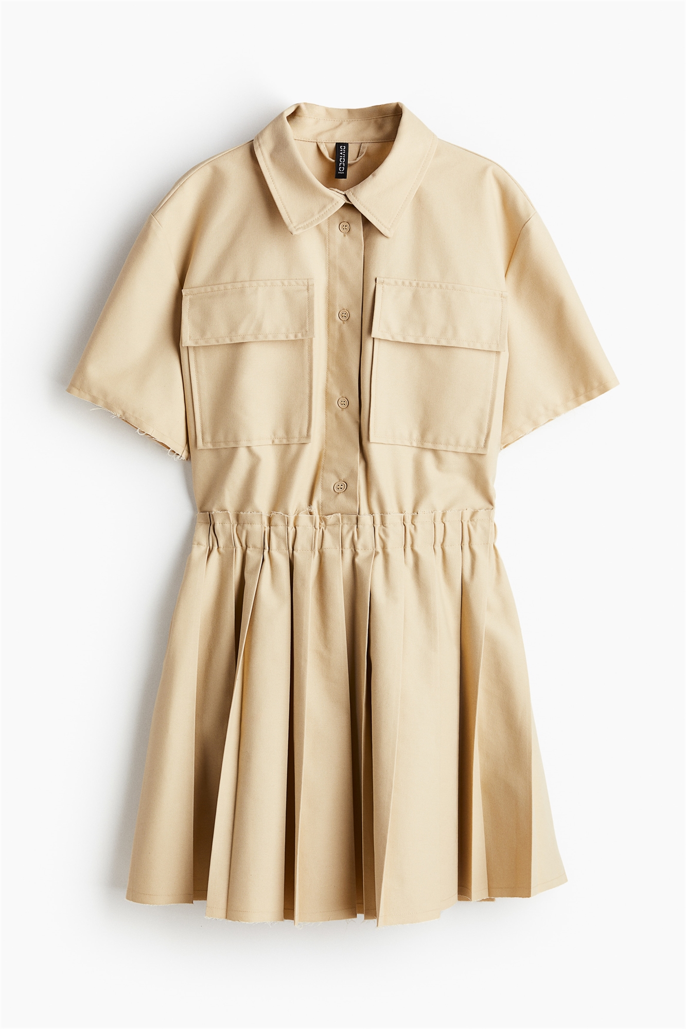 Короткое платье из саржи с воротником, пуговицами в верхней части спереди и накладными нагрудными карманами. Спущенные плечи, короткие рукава, эластичная резинка на талии и расклешенная плиссированная юбка. Необработанные края манжет и подола. Без подкладки.