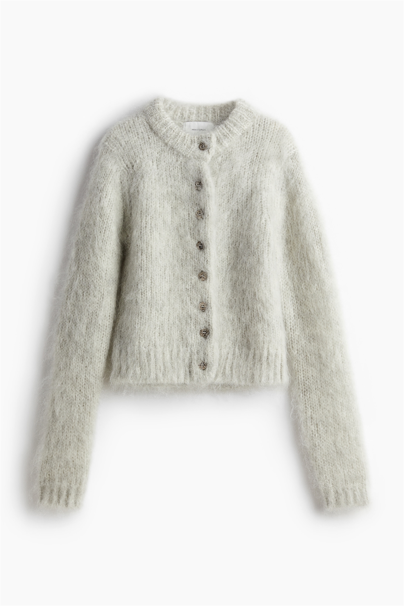 Приталенный кардиган из мягкого трикотажа из смеси мохера. Мраморные пуговицы спереди и тесемки вокруг выреза, на манжетах и подоле.