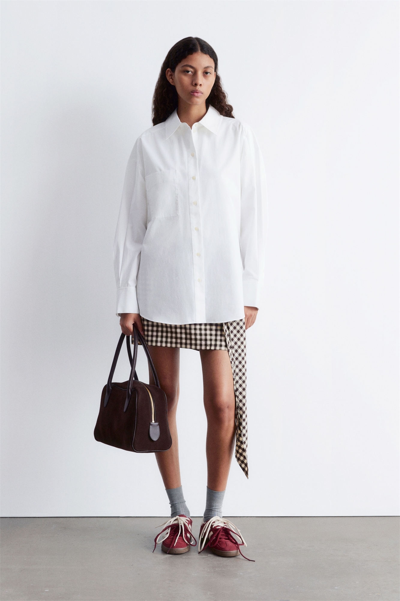 Рубашка оверсайз с накладным карманом на груди. • Отложной воротник • Застежка на восемь пуговиц • Манжеты на пуговицах • Длина рубашки: 79,5 см / 31,3" (размер S)