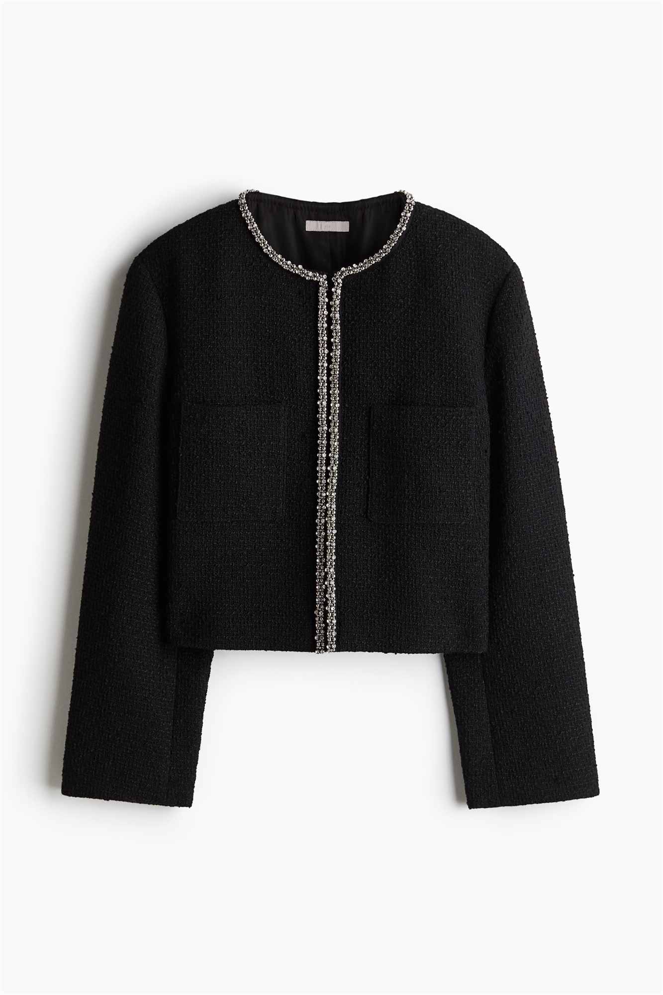 Короткий открытый жакет из букле, украшенный стразами и бисером по вырезу горловины и спереди. Накладные нагрудные карманы, слегка спущенные плечи и длинные рукава. На подкладке.