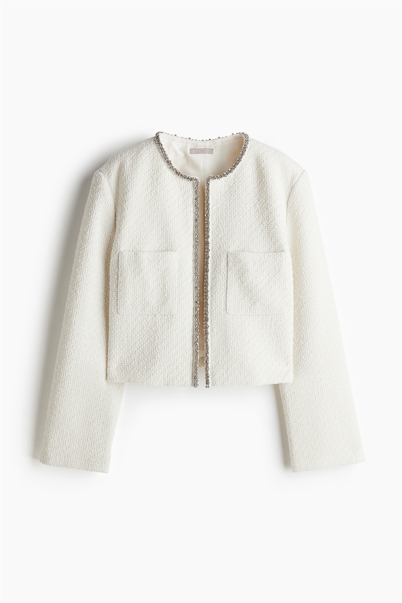 Короткий открытый жакет из букле, украшенный стразами и бисером по вырезу горловины и спереди. Накладные нагрудные карманы, слегка спущенные плечи и длинные рукава. На подкладке.