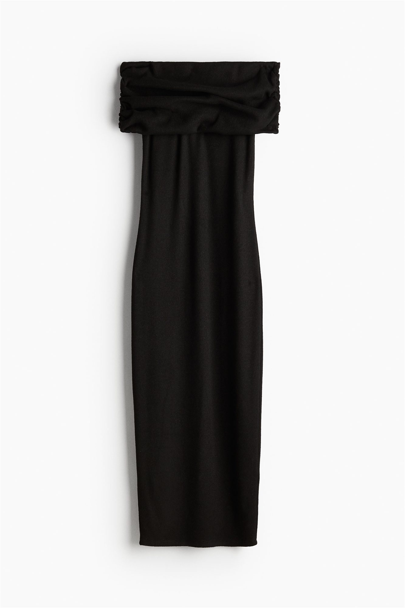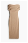 Длинное, приталенное платье без плеч из тонкого трикотажа в рубчик с широкими складками и завязками в верхней части.