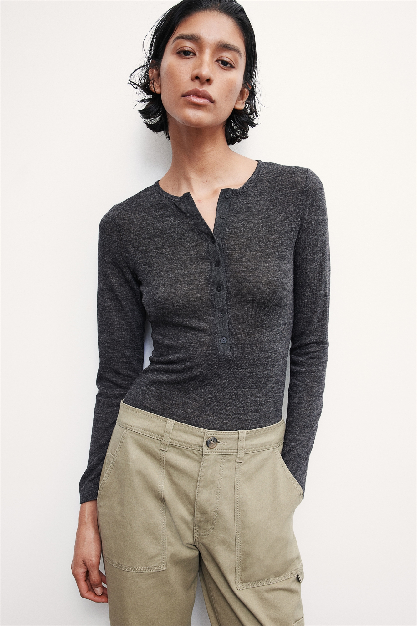 Облегающий топ Henley из тонкого трикотажа с круглым вырезом, застежкой на пуговицы и длинными рукавами.