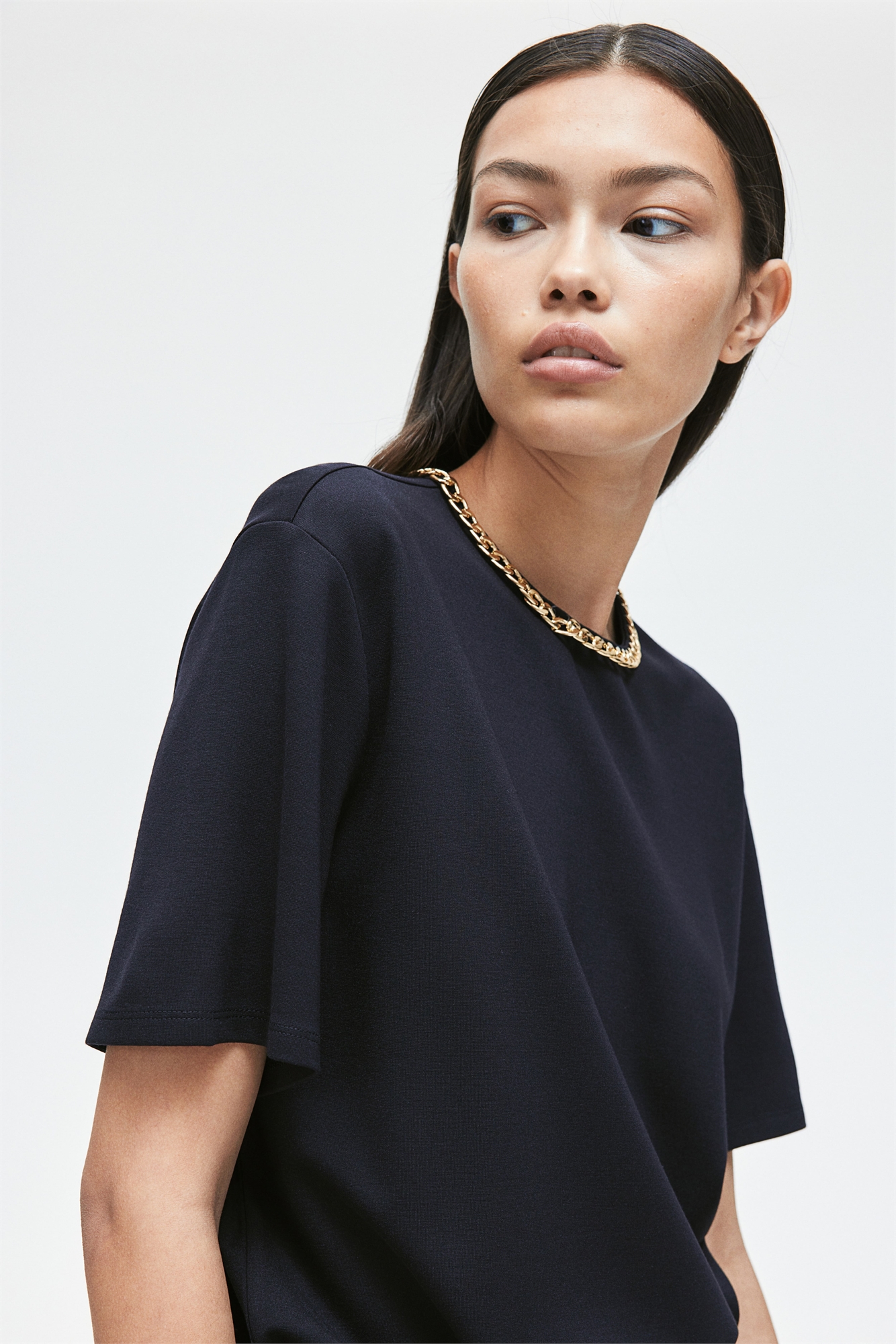 Свободный топ из плотного трикотажа с круглым вырезом, украшенным цепочками, короткими рукавами и прорезью для ключа с потайной застежкой-крючком сзади на шее.