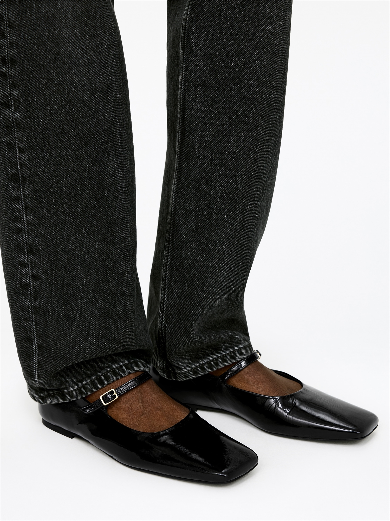 Кожаные ластовицы с квадратным носком и плоской подошвой. Тонкий ремешок с изящной позолоченной пряжкой. Тонкая резиновая подошва.