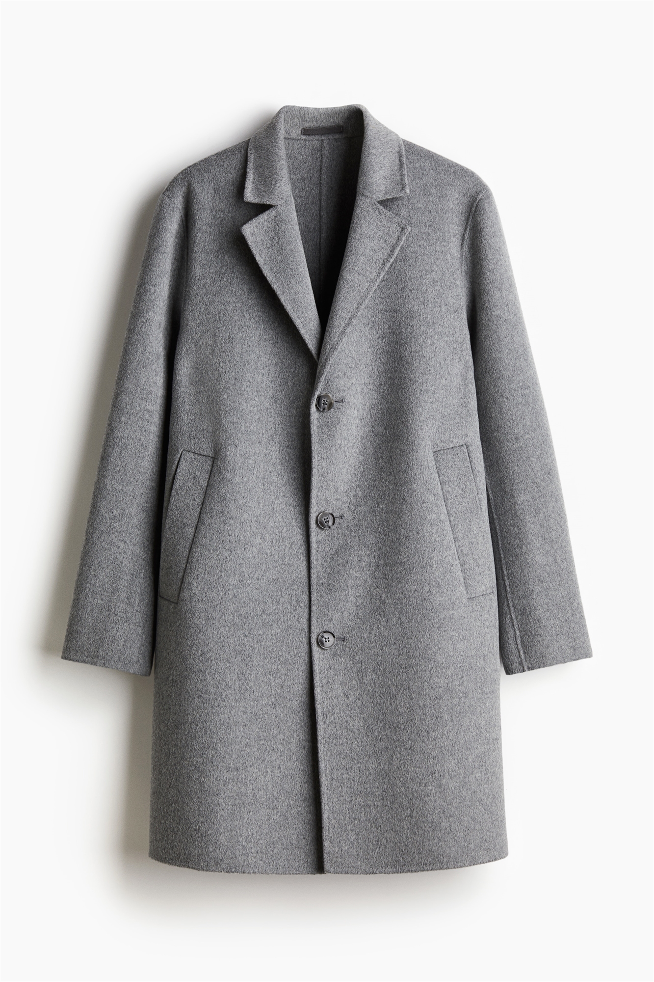 Однобортное пальто длиной до колена из шерсти с пикообразными лацканами, пуговицами спереди, длинными рукавами и втачными карманами спереди. Регулярный крой для комфортного ношения и классического силуэта. Без отделки.