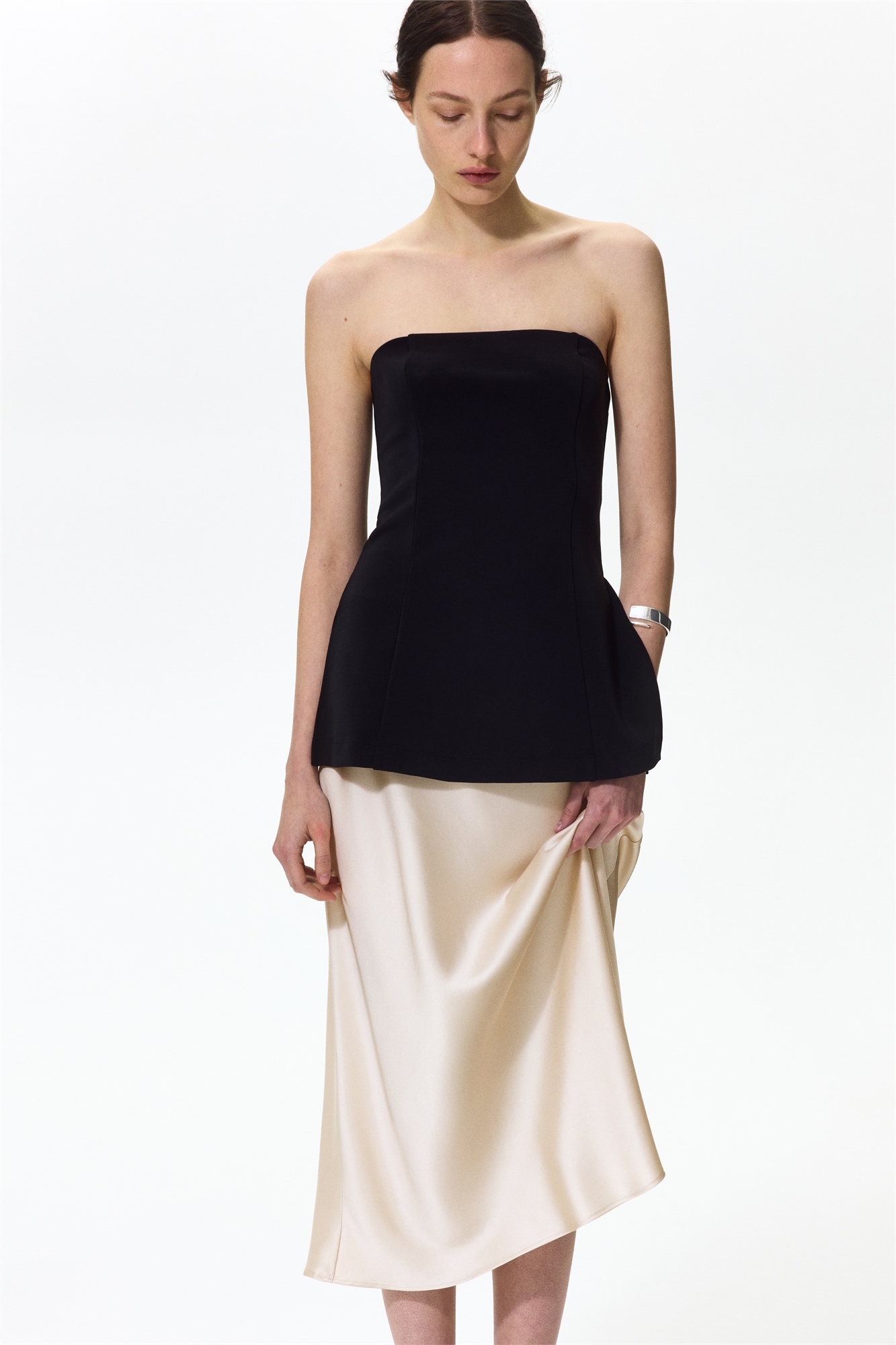 Юбка длиной до колена из мягко драпирующегося материала с легким блеском. Высокая талия со скрытой эластичной резинкой и мягкий расклешенный подол. Без подкладки.