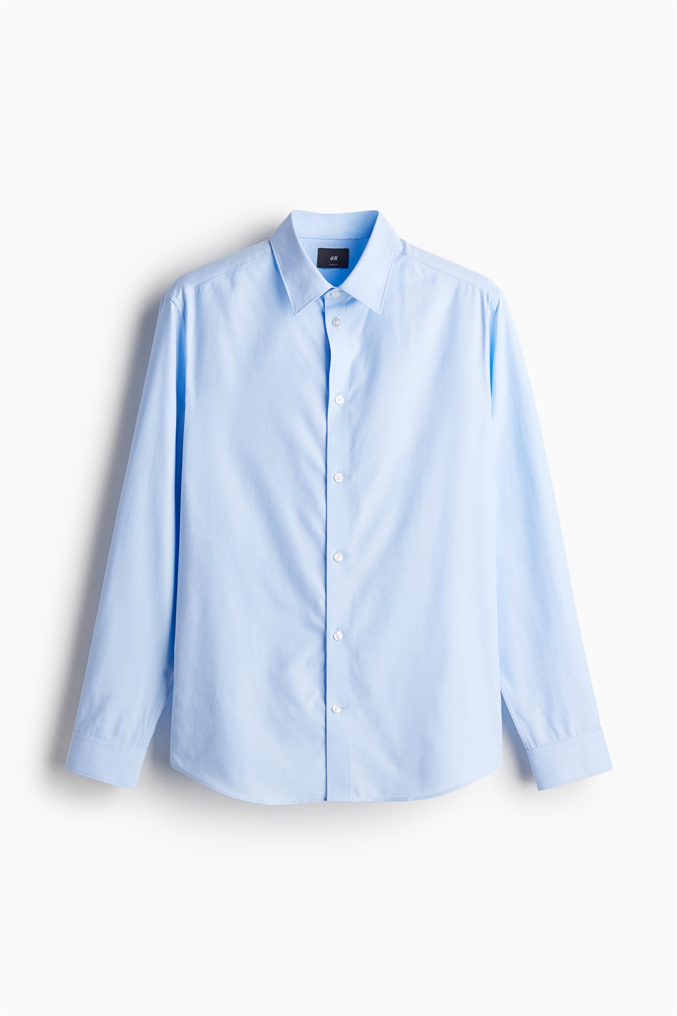 Рубашка из хлопка пима с отложным воротником, французской отделкой спереди и ярмом сзади. Длинные рукава с манжетами на пуговицах и рукавной планкой с пуговицей-звеном, а также закругленный подол. Зауженный крой, облегающий контуры тела и создающий приталенный силуэт.