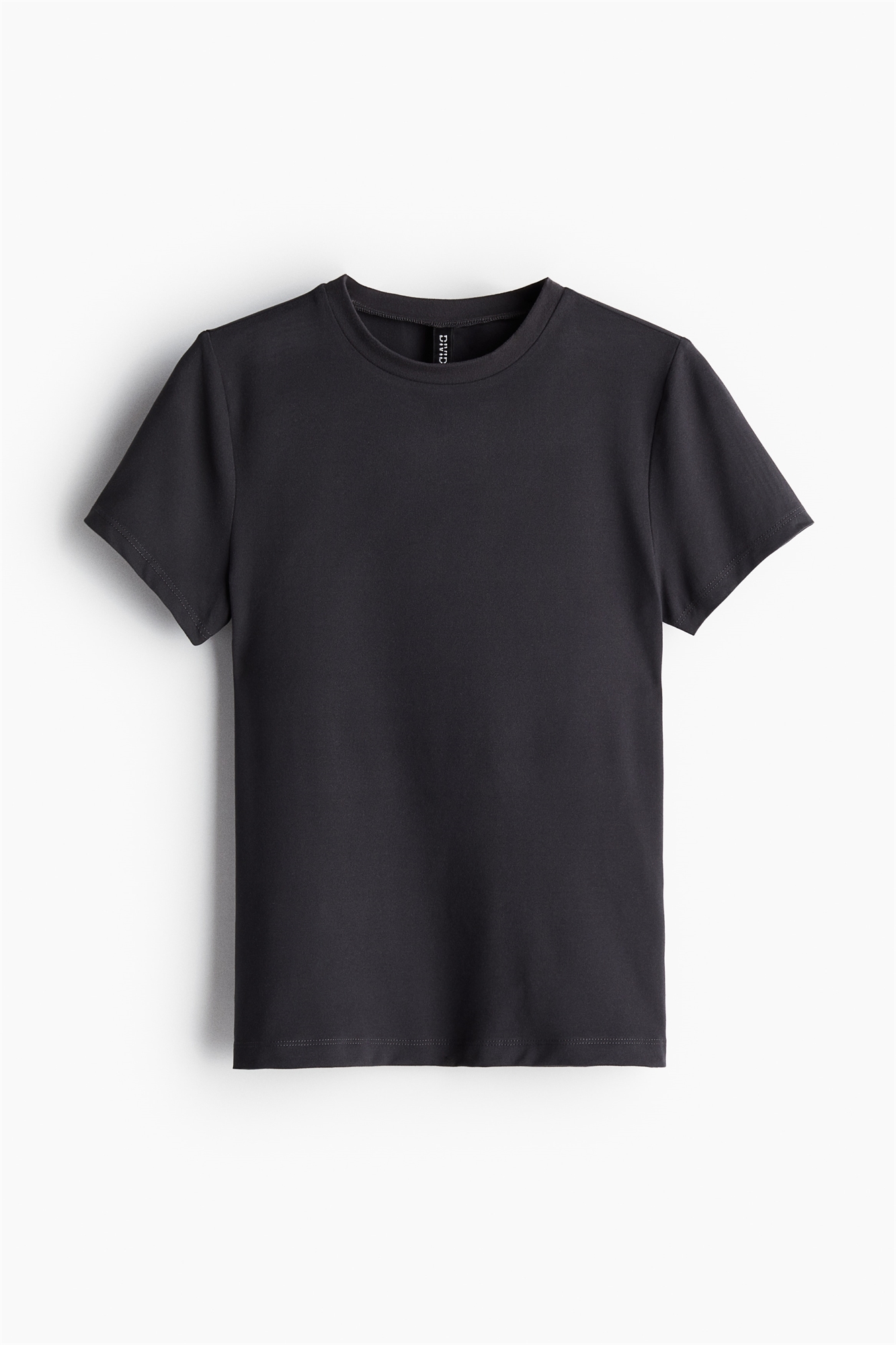 Облегающая футболка из эластичного трикотажа с узкой окантовкой по вырезу горловины и прямым покроем.