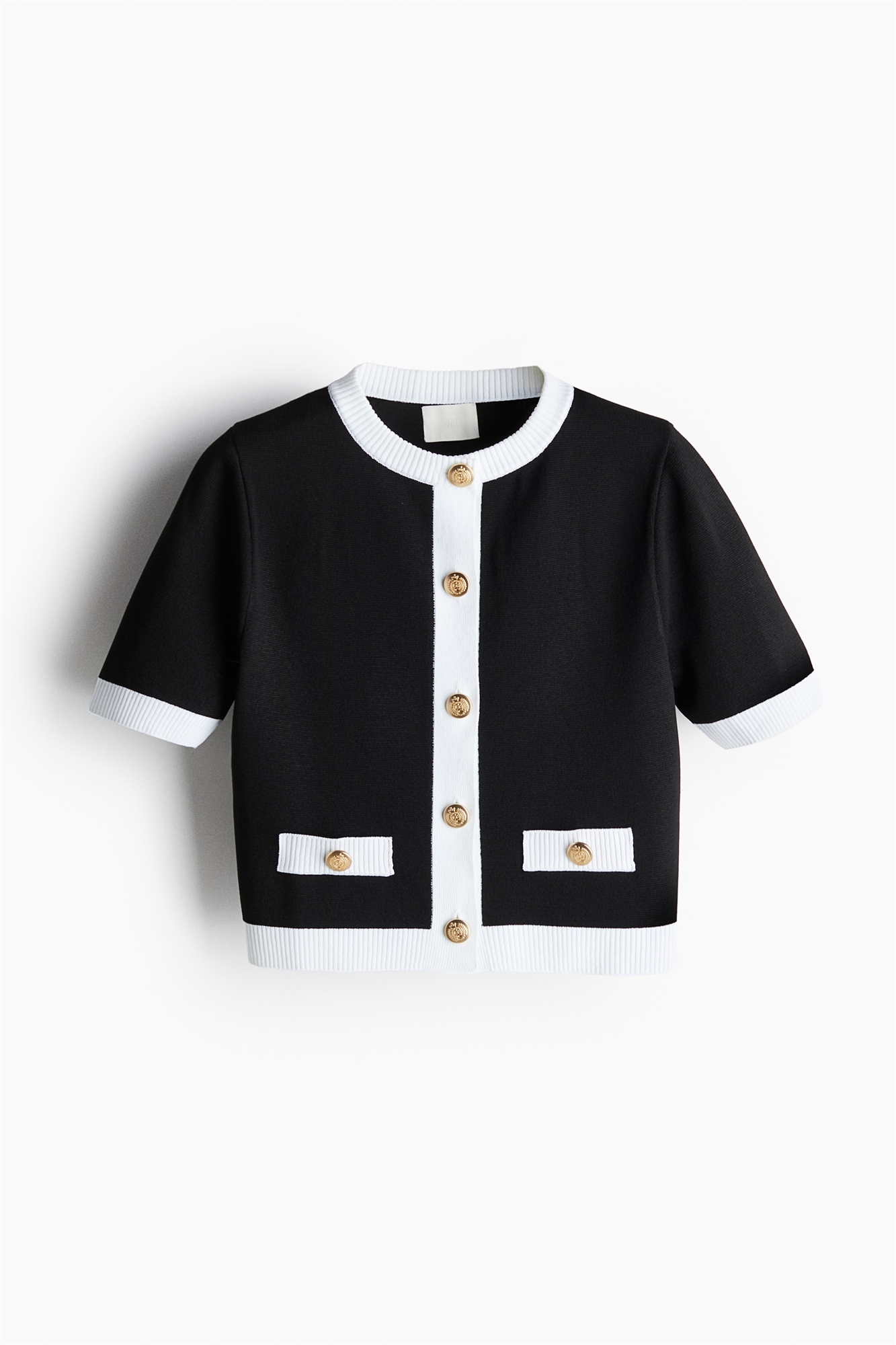 Короткий приталенный кардиган из прочного трикотажа с круглым вырезом, металлическими пуговицами спереди и короткими рукавами. Прорезные карманы с пуговицей спереди.
