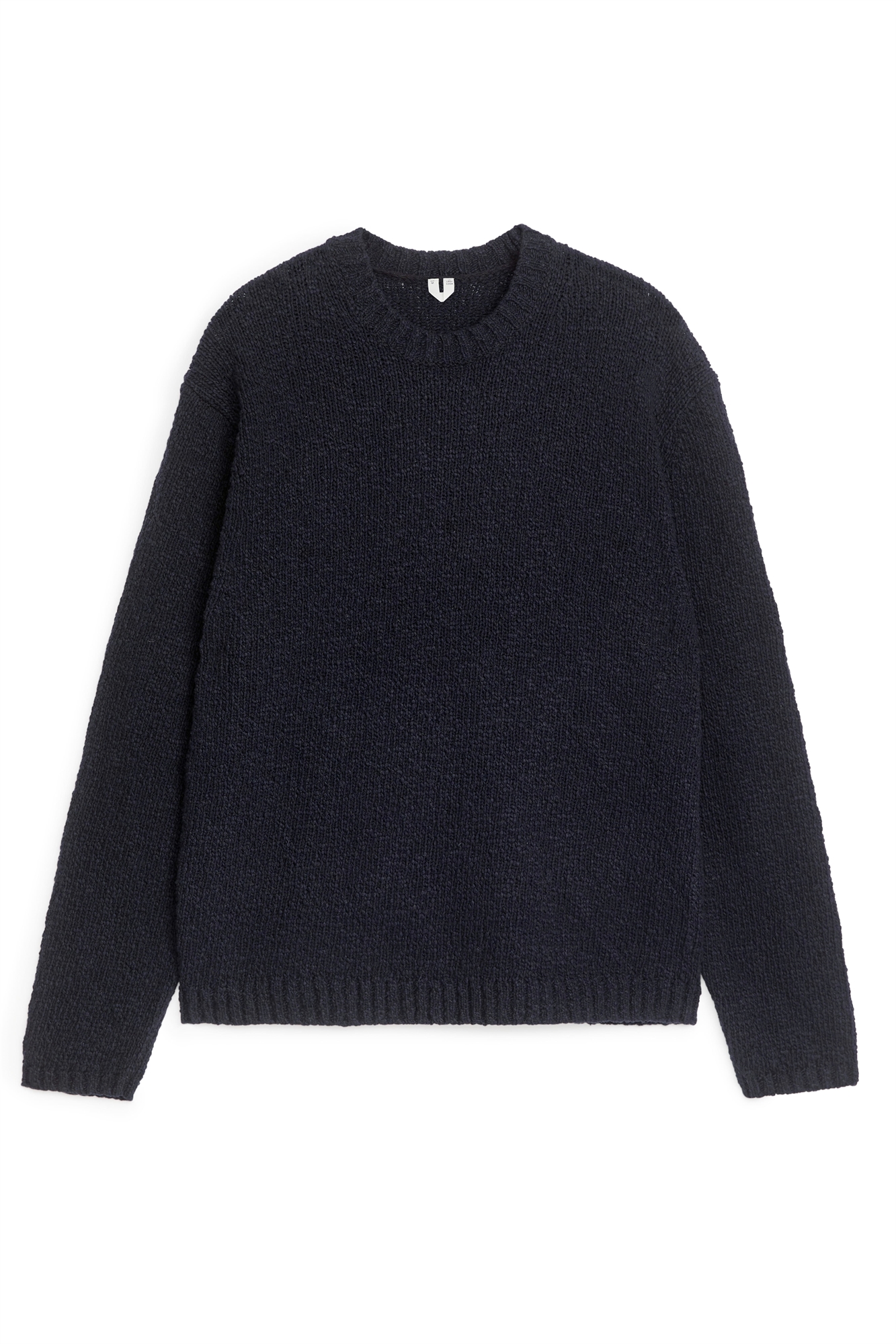 Джемпер с круглым вырезом, вязаный ленточной пряжей из хлопка. Отделка ребристой вязкой. Джемпер имеет обычный крой и слегка спущенные плечи.