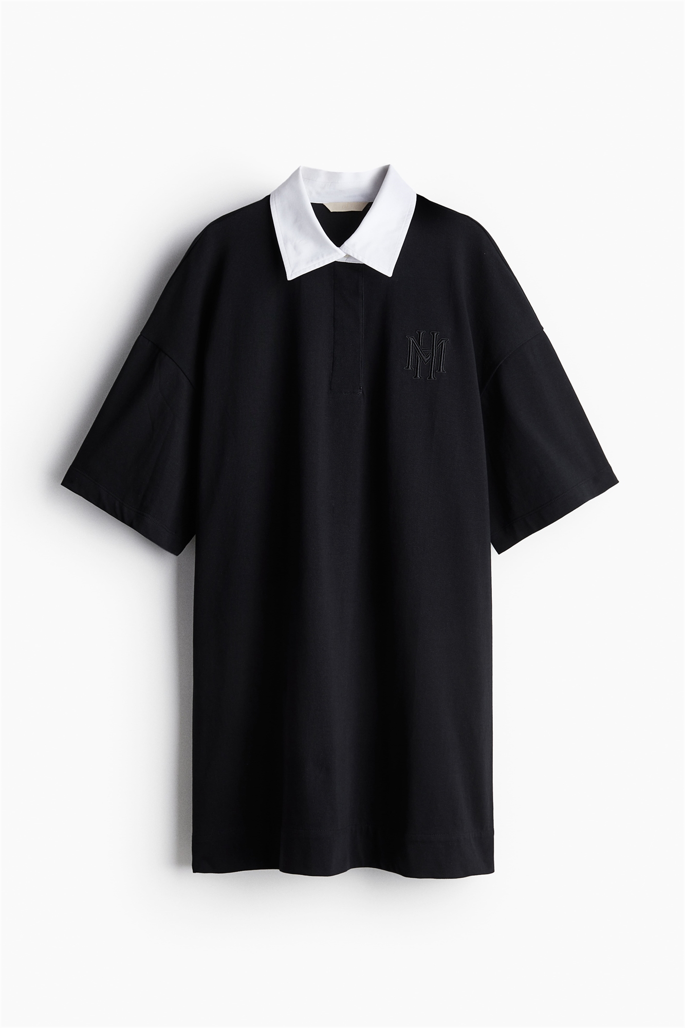 Короткое платье из плотного хлопкового джерси с рубашечным воротником и потайной застежкой на пуговицы из поплина. Свободный крой, спущенные плечи, короткие рукава и деталь вышивки на груди.