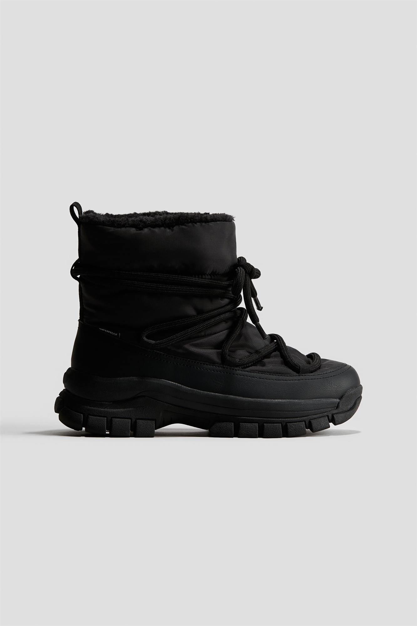 Ботинки с теплой подкладкой и водонепроницаемой мембраной, чтобы ноги оставались сухими. Петля сзади и шнуровка спереди. Подкладка из ворсистой ткани и стелька из технической пены Cellfit™ для дополнительного комфорта. Мохнатая подошва с рисунком. Высота подошвы 5 см.