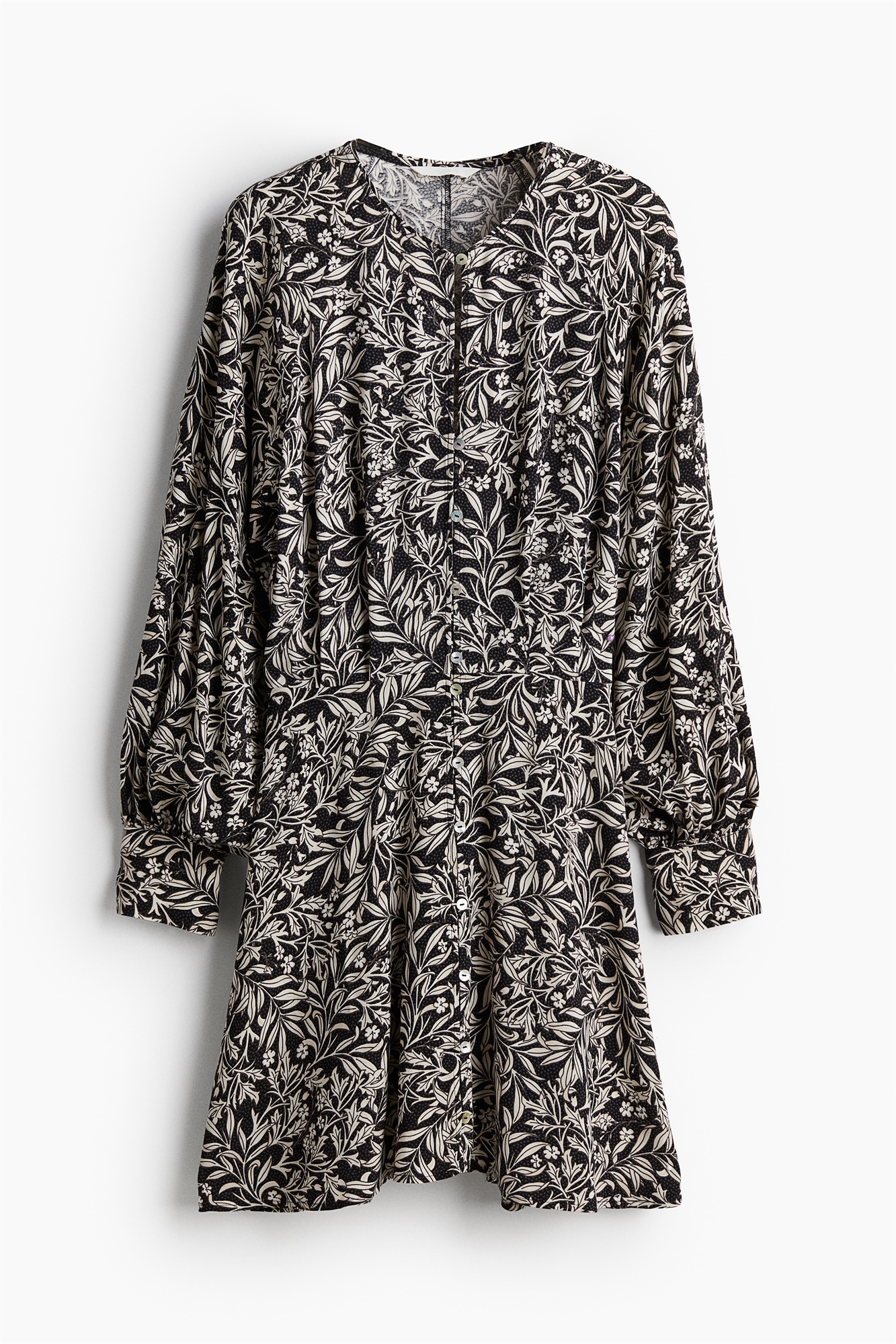 Короткое платье из тканого материала с круглым вырезом и пуговицами спереди. Длинные рукава реглан и широкие манжеты с разрезом и пуговицей. Складки спереди, узкая резинка сзади на талии и слегка расклешенная юбка. Без подкладки.