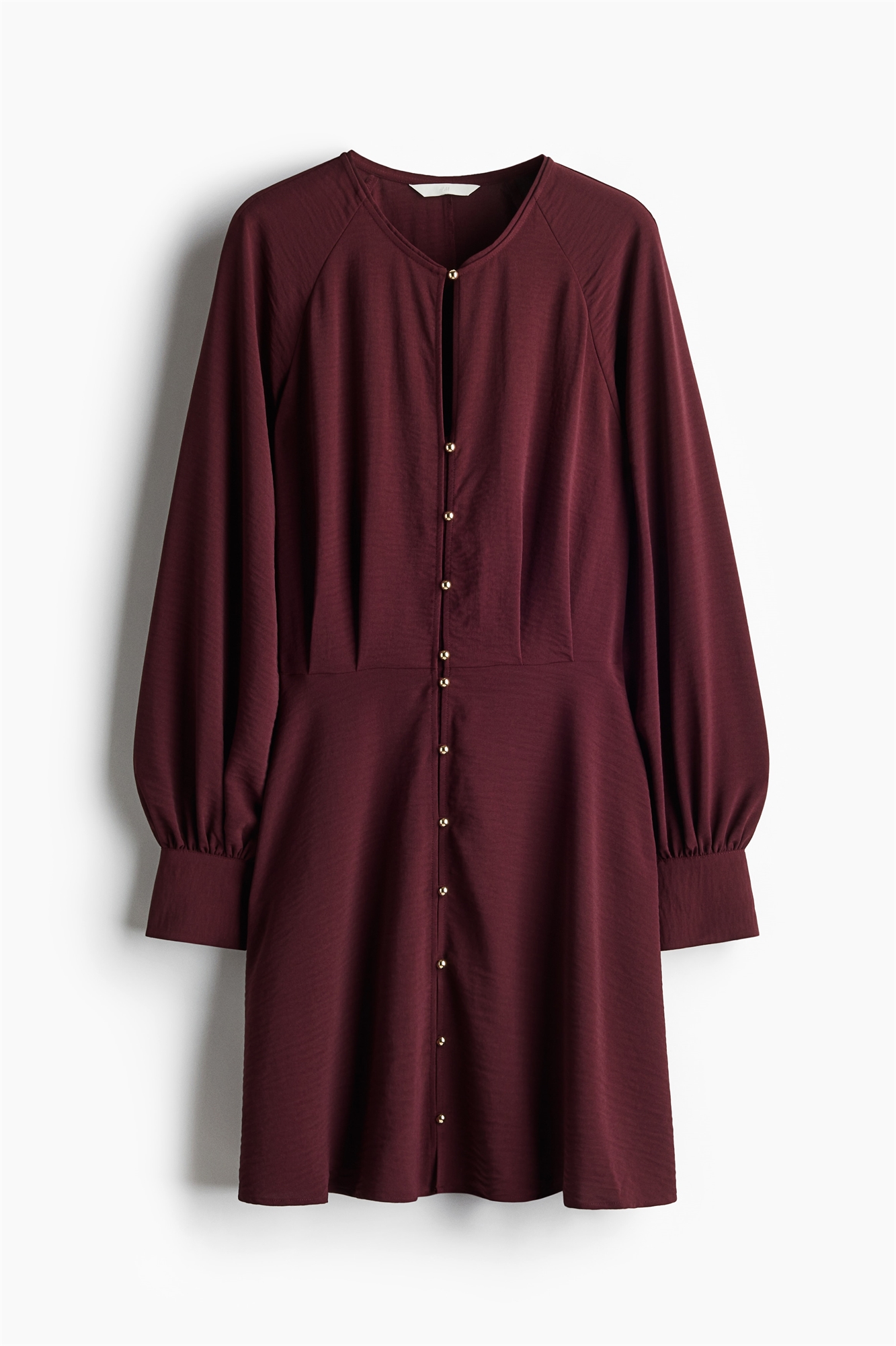 Короткое платье из тканого материала с круглым вырезом и пуговицами спереди. Длинные рукава реглан и широкие манжеты с разрезом и пуговицей. Складки спереди, узкая резинка сзади на талии и слегка расклешенная юбка. Без подкладки.