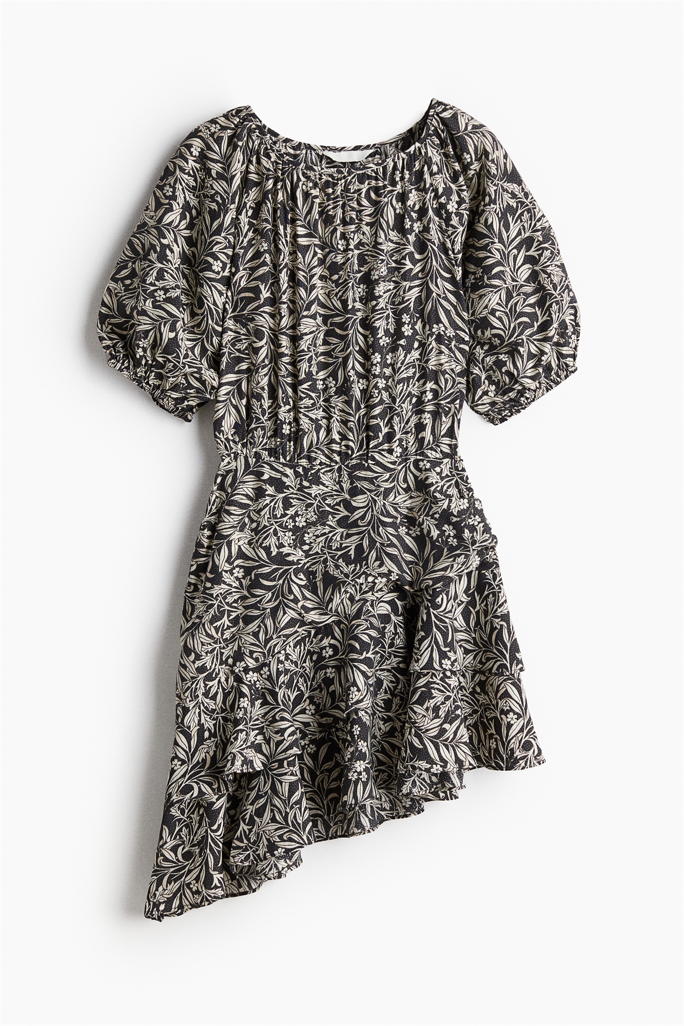 Короткое платье из тканого материала с вырезом-лодочкой и рукавами-баллончиками длиной до локтя с узкими эластичными манжетами. Потайная застежка-молния с одной стороны, узкая эластичная резинка сзади на талии и слегка расклешенная юбка с асимметричным подолом с воланами. На подкладке.