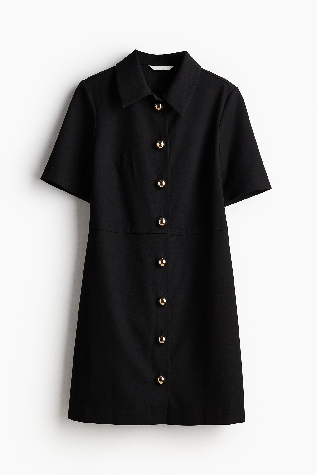 Короткое приталенное платье из саржи с воротником, пуговицами золотого цвета спереди и короткими рукавами. Формирующие вытачки сзади и слегка расклешенная юбка. Без подкладки.