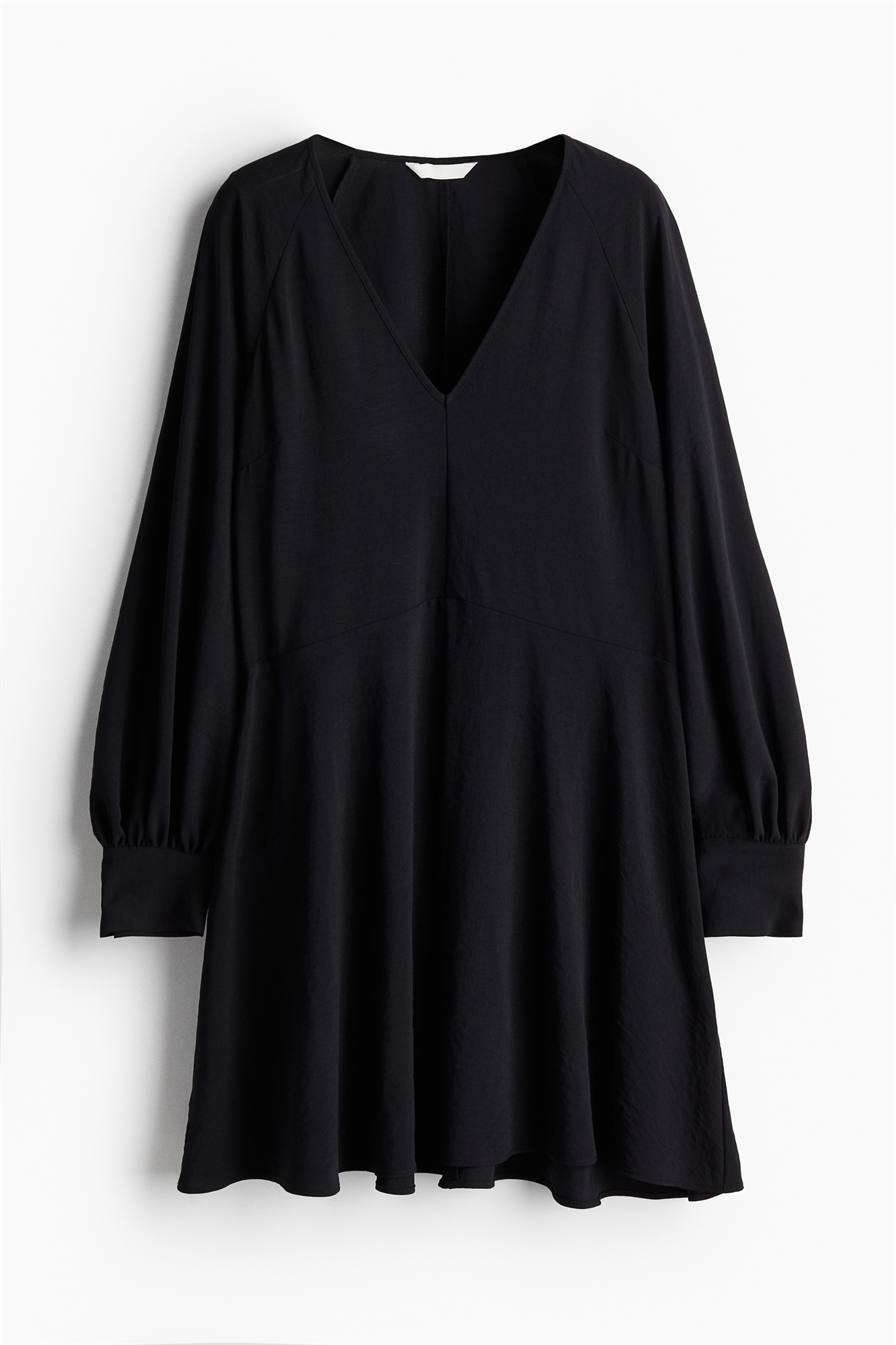 Короткое платье из тканого материала с глубоким V-образным вырезом, длинными рукавами реглан с разрезом и пуговицей на манжетах и расклешенной юбкой. Без подкладки.