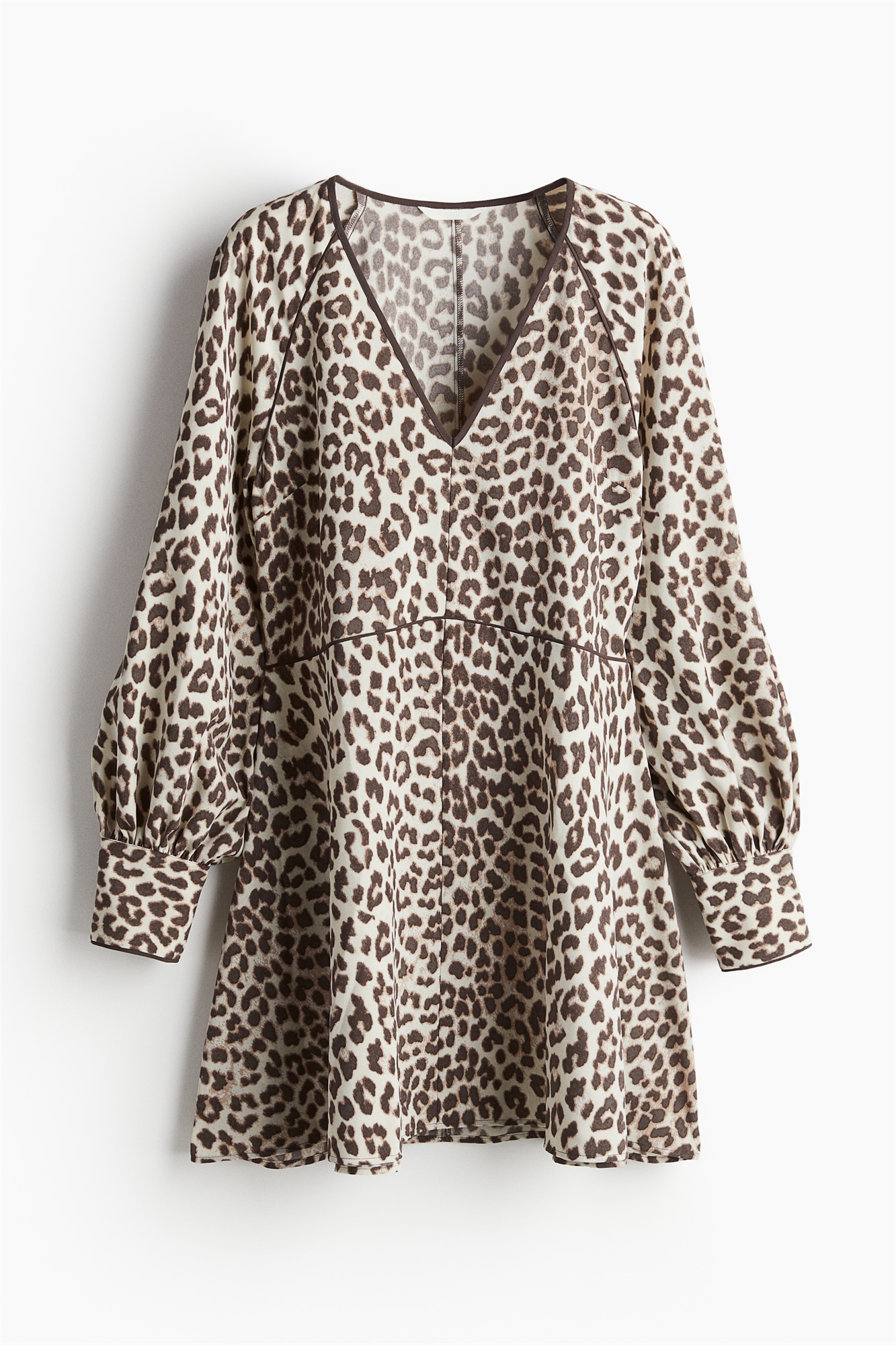 Короткое платье из тканого материала с глубоким V-образным вырезом, длинными рукавами реглан с разрезом и пуговицей на манжетах и расклешенной юбкой. Без подкладки.