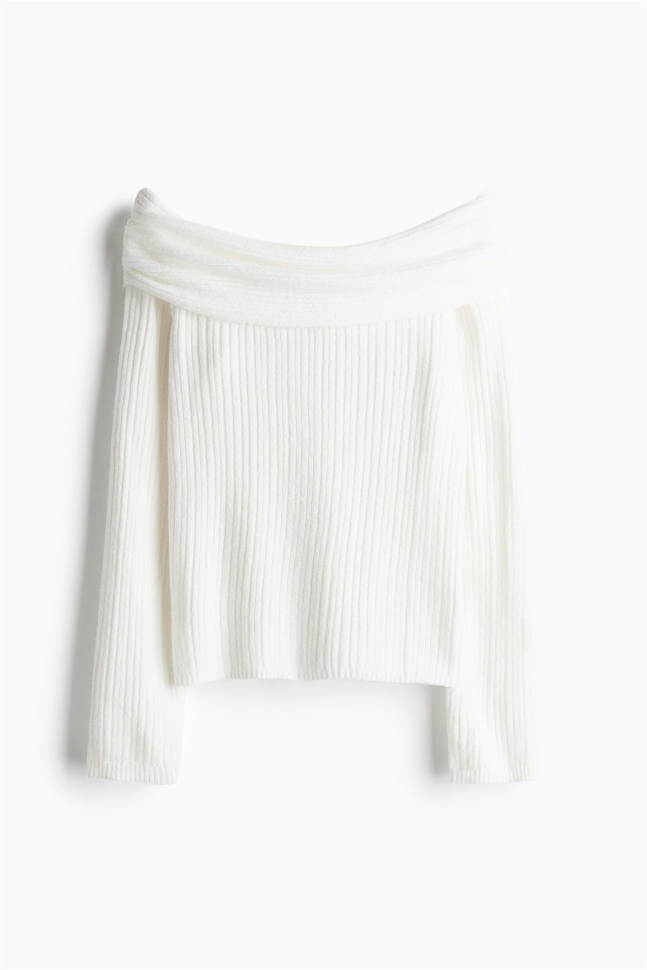 Короткий джемпер без плеч из мягкого трикотажа в рубчик с широким отворотом и длинными рукавами.