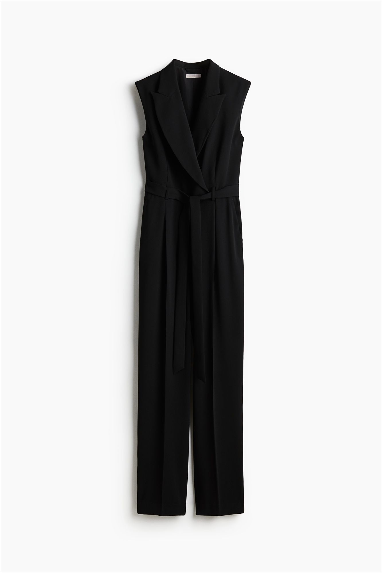 Джемпер-блейзер без рукавов из крепового полотна с отворотами-пиками и облегающим передом с потайной застежкой. Завязывающийся пояс на талии, диагональные боковые карманы и втачные карманы сзади. Застежка-молния и слегка зауженные ноги со складками спереди и сзади. Лиф на подкладке.