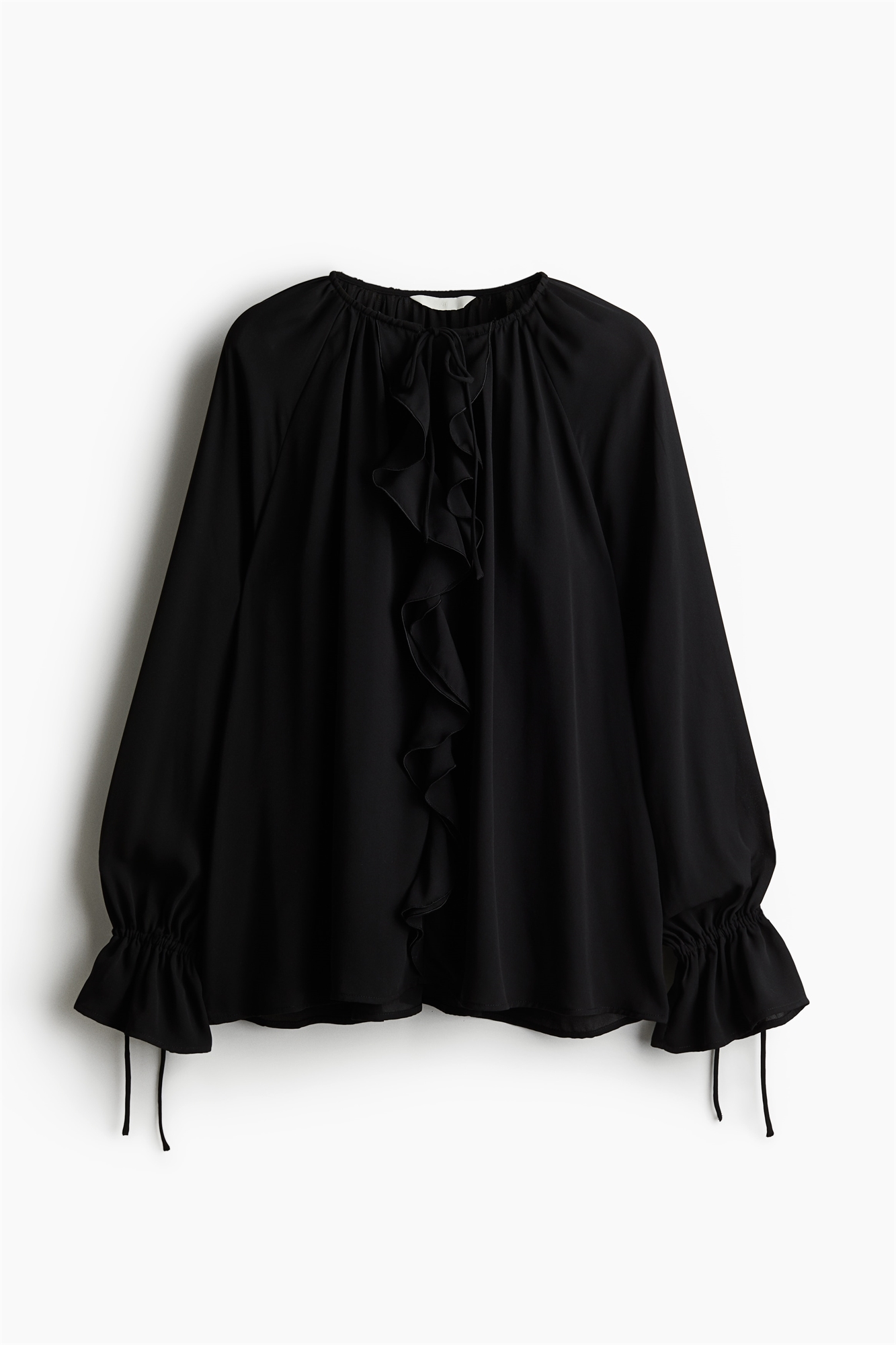 Блузка больших размеров из крепового полотна с круглым вырезом, оборками спереди и глубокой проймой с завязками-спагетти. Длинные рукава реглан с эластичными манжетами с воланами и завязками-спагетти на запястьях.