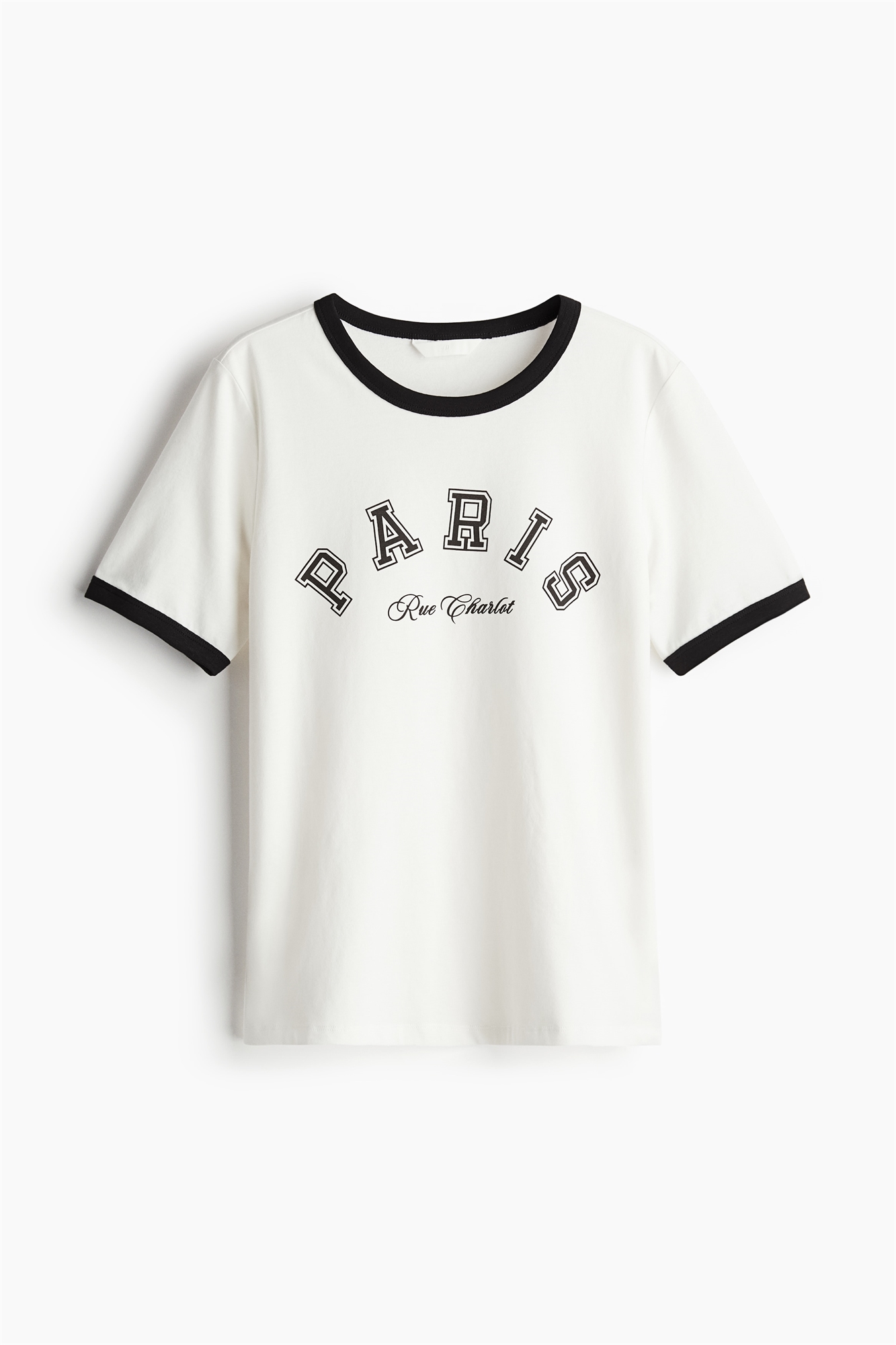 Облегающая футболка из мягкого хлопкового джерси с текстовым мотивом спереди и узкой тесьмой по вырезу горловины и на манжетах.