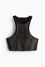 Облегающий топ из плотного джерси, украшенный металлическими шипами по всей длине. Круглый вырез, узкий разрез в верхней части и застежка на потайную молнию. На подкладке.