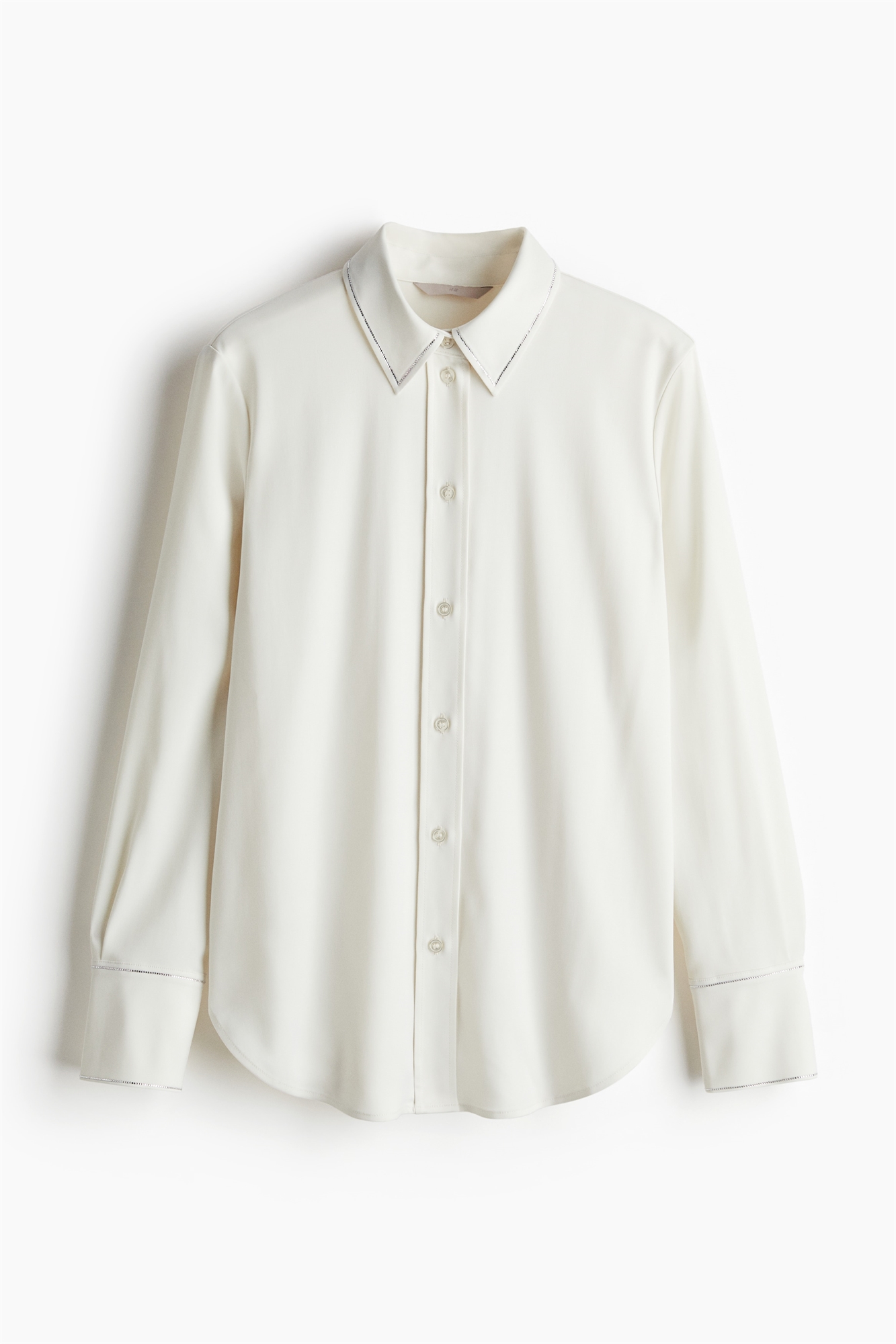 Рубашка из тканого материала, украшенная узкими нитями сверкающих страз на воротнике и манжетах. Пуговицы спереди и ярмо со складками сзади. Длинные рукава с манжетами на пуговицах и рукавной планкой с пуговицей. Закругленный подол.