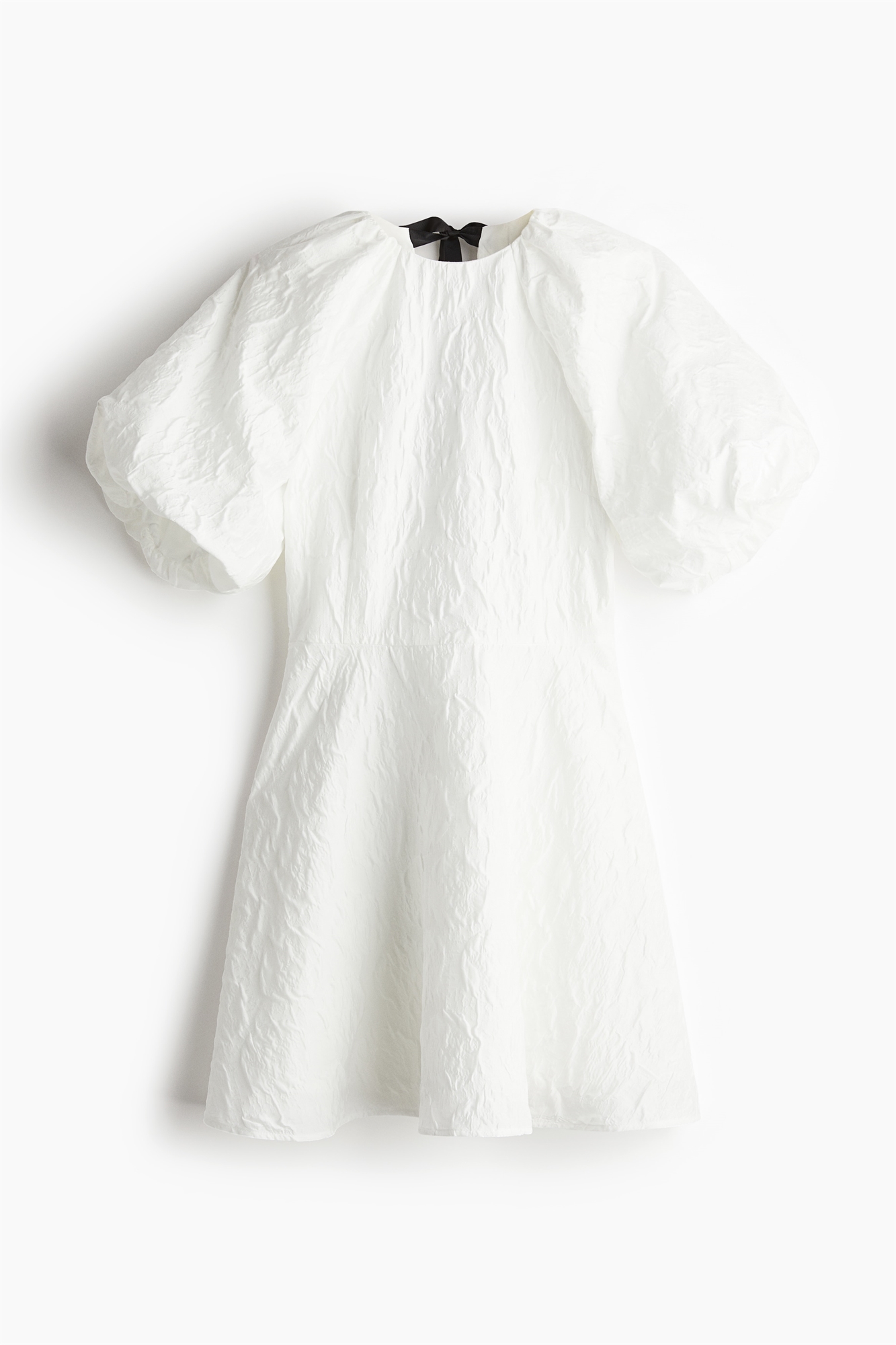 Короткое платье из жаккардового переплетения с круглым вырезом и проймой с двумя парами завязок из ленты гросгрейн сзади. Вытачки на груди, короткие приталенные рукава реглан и потайная застежка-молния с одной стороны. Аккуратная расклешенная юбка.