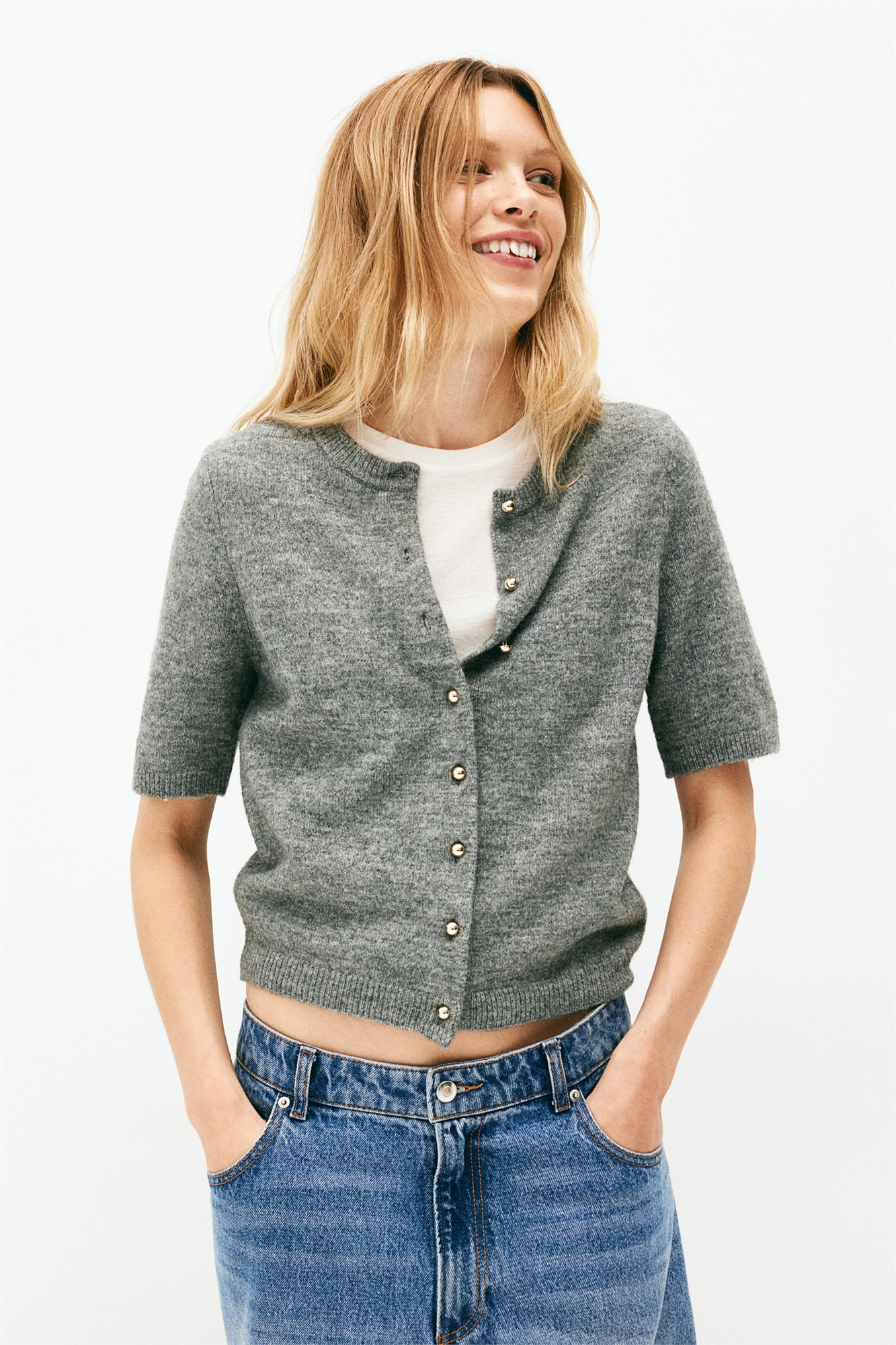 Кардиган с короткими рукавами из мягкого трикотажа с добавлением шерсти. Круглый вырез с ребристой отделкой, блестящие пуговицы спереди и тесемки на манжетах и подоле.