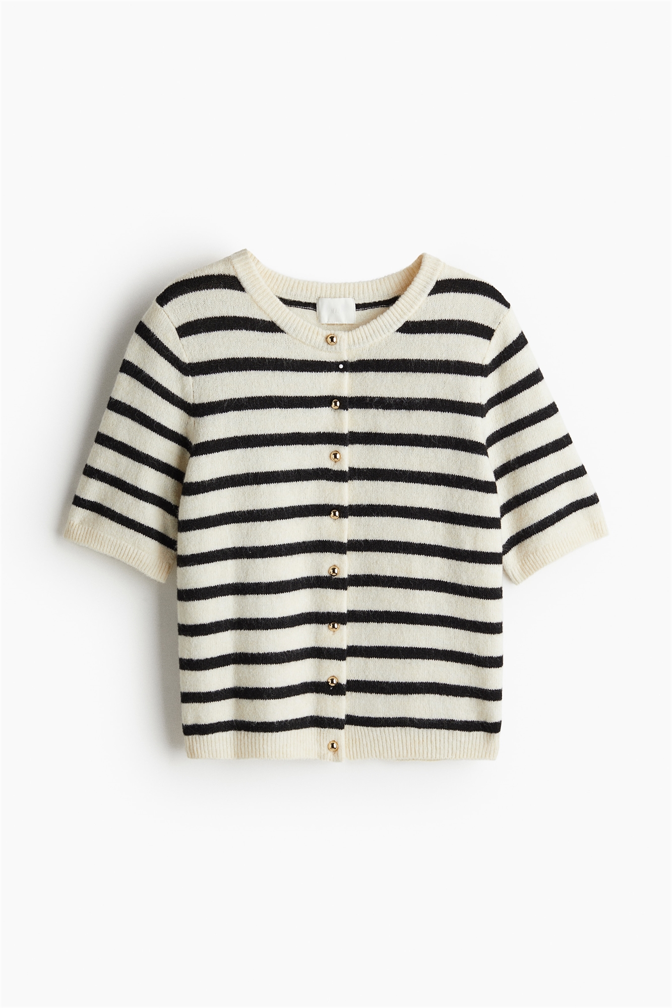 Кардиган с короткими рукавами из мягкого трикотажа с добавлением шерсти. Круглый вырез с ребристой отделкой, блестящие пуговицы спереди и тесемки на манжетах и подоле.