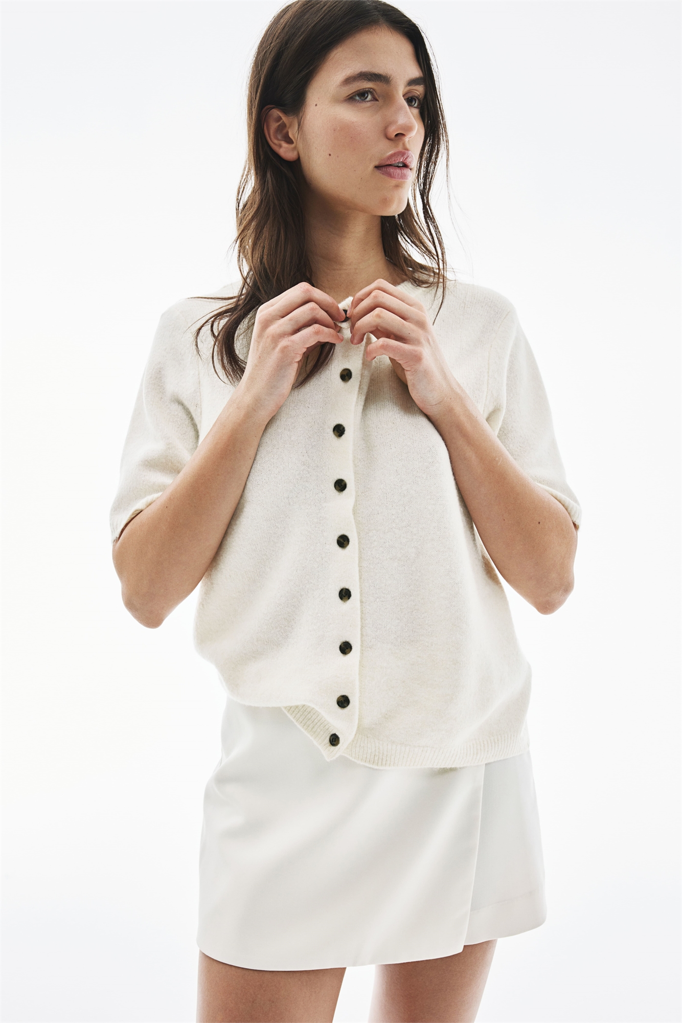 Кардиган с короткими рукавами из мягкого трикотажа с добавлением шерсти. Круглый вырез с ребристой отделкой, блестящие пуговицы спереди и тесемки на манжетах и подоле.