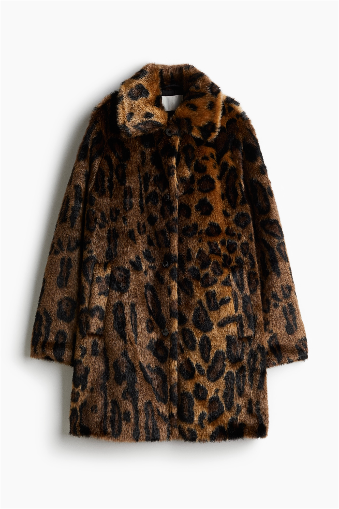 Пальто из пушистой ткани с воротником, застежкой на пуговицы спереди и втачными боковыми карманами. На подкладке.