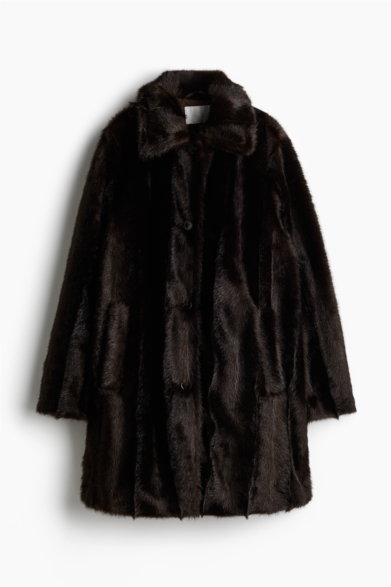 Пальто из пушистой ткани с воротником, застежкой на пуговицы спереди и втачными боковыми карманами. На подкладке.