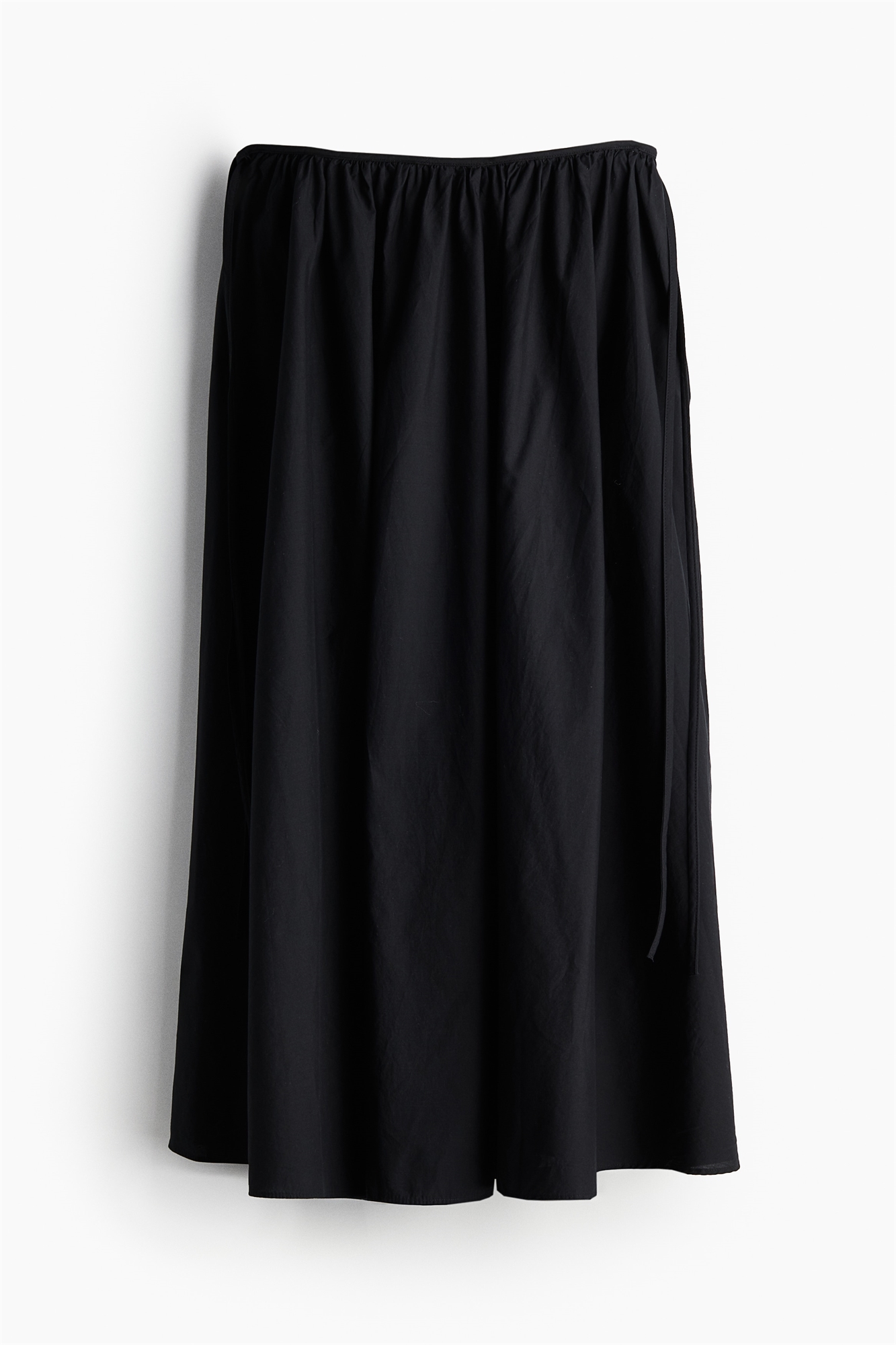 Круглая юбка длиной до щиколоток из воздушного хлопкового полотна с высокой талией и узкими завязками с каждой стороны. Скрытая застежка-молния с одной стороны и прямой подол. Без подкладки.