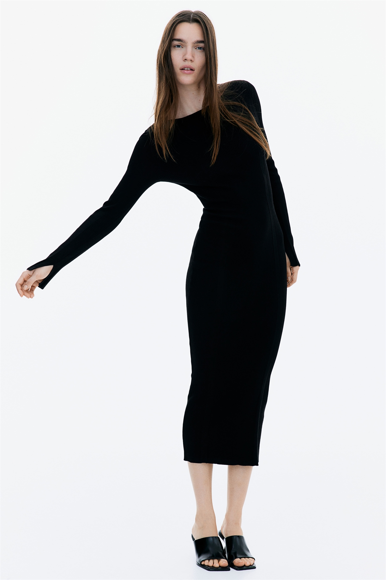 Длинное приталенное платье из трикотажа в рубчик с широким вырезом, низкой спинкой и длинными рукавами с разрезом на манжетах.