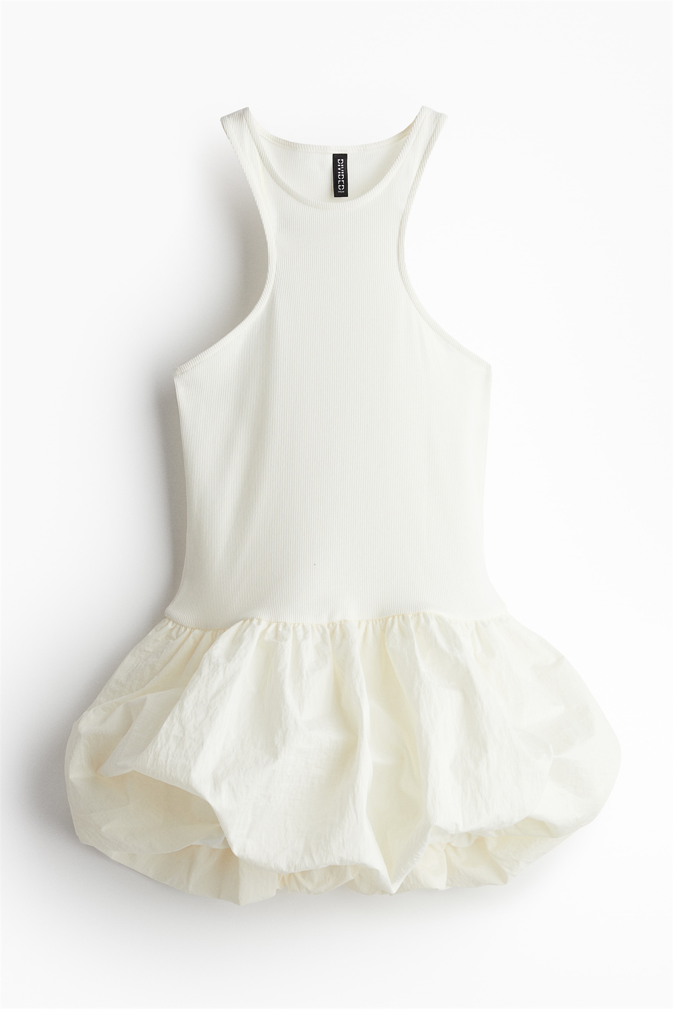 Короткое платье без рукавов из ребристого хлопкового джерси с приталенным лифом, круглым вырезом, узким разрезом в верхней части и задиром на спине. Присборенный шов на бедрах и объемная нейлоновая юбка с пузырчатым подолом для пышного силуэта.
