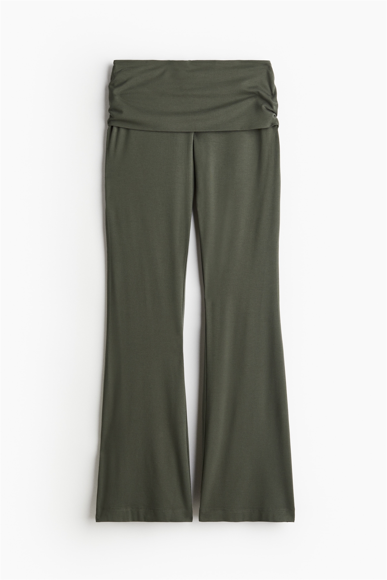 Облегающие брюки из мягкого трикотажа с заниженной талией, откидным поясом и расклешенными краями.