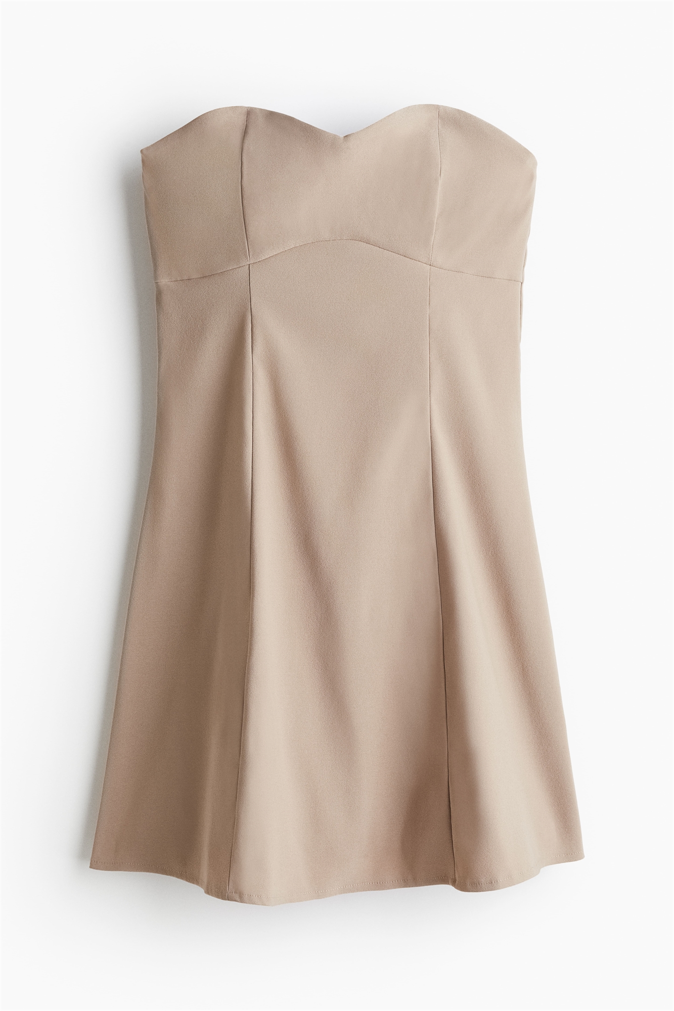 Короткое платье-бандо из тканого материала с приталенным лифом, мягко изогнутым швом под бюстом и потайной застежкой на молнию и крючок-глаз сзади. Расклешенная юбка и подол прямого кроя. На подкладке.