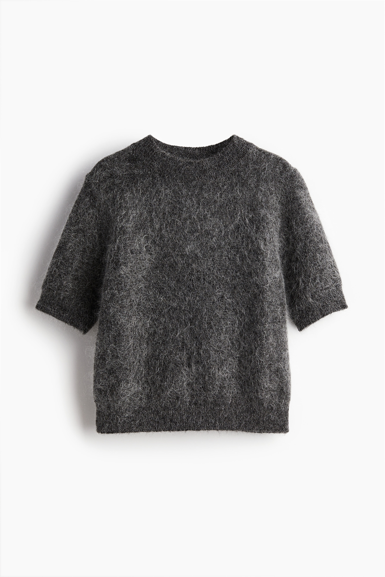 Короткий топ из мягкого трикотажа с содержанием мохера и шерсти. Круглый вырез с ребристой отделкой, короткие рукава, манжеты и подол в рубчик.