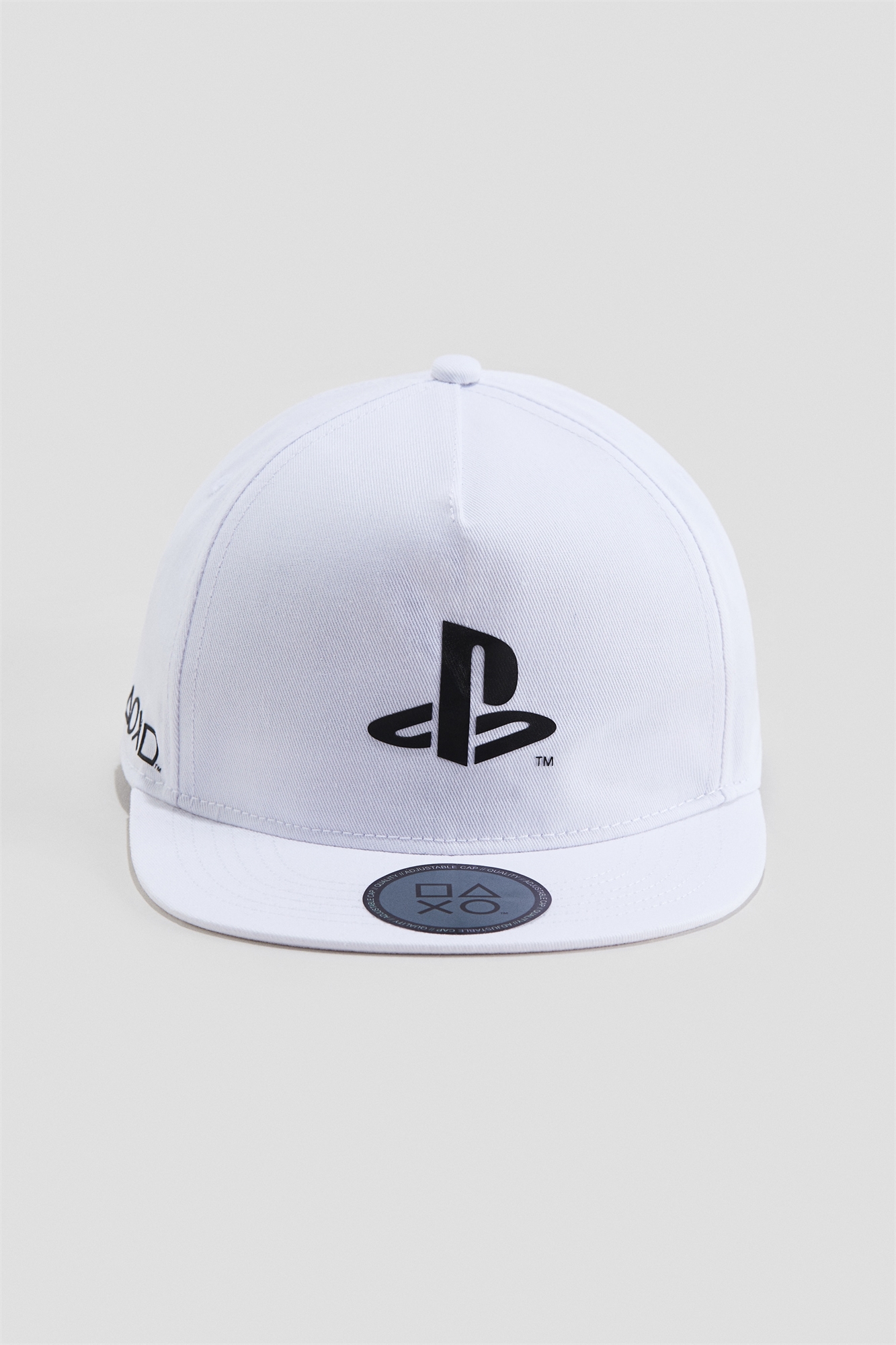 Кепка из хлопковой саржи с принтом спереди, плоским козырьком, вышитыми люверсами и регулируемой пластиковой застежкой сзади.