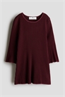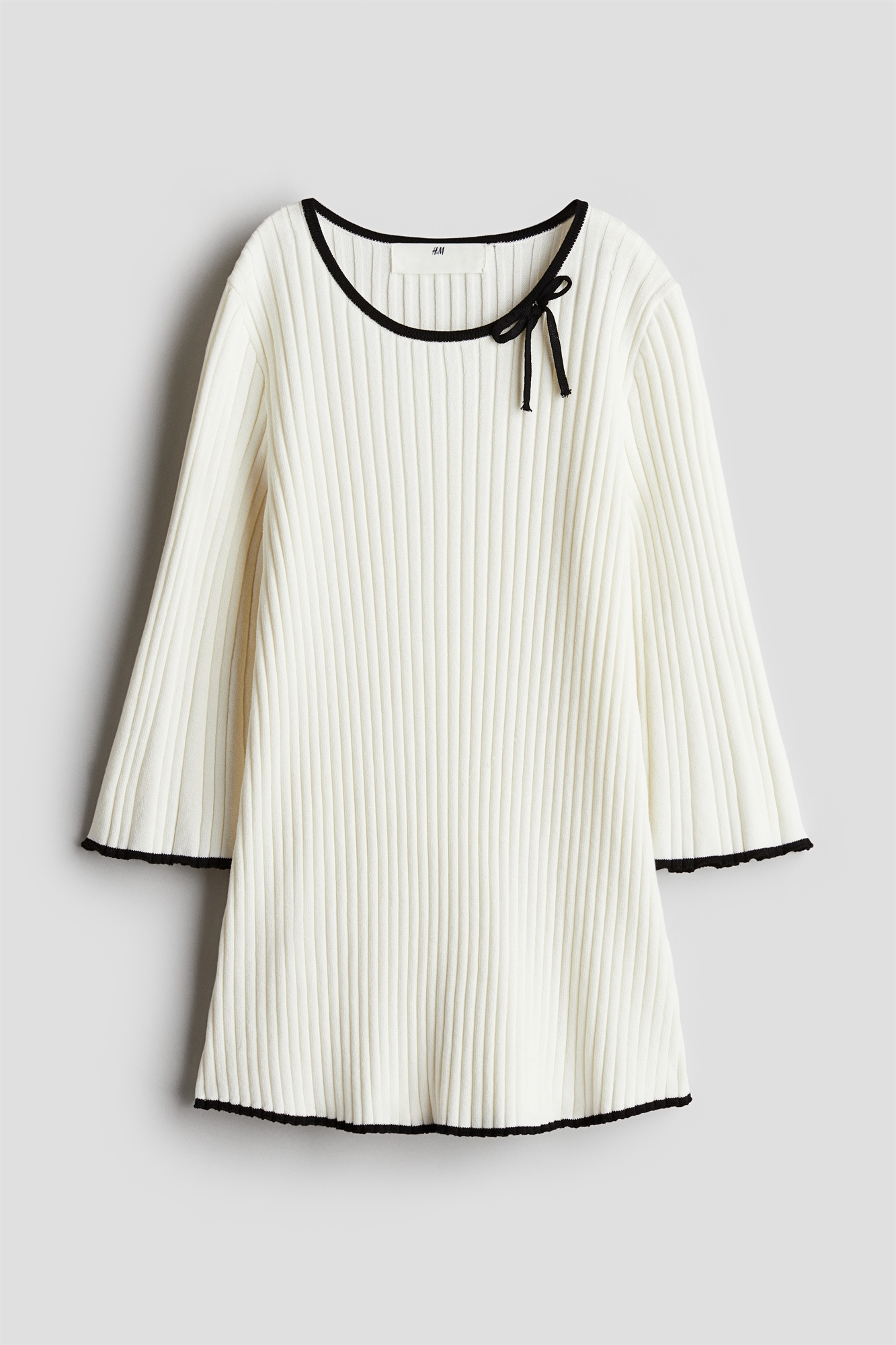 Платье из мягкого трикотажа в рубчик с круглым вырезом, длинными рукавами-трубами и расклешенной юбкой. Отделка контрастного цвета по вырезу, манжетам и подолу.