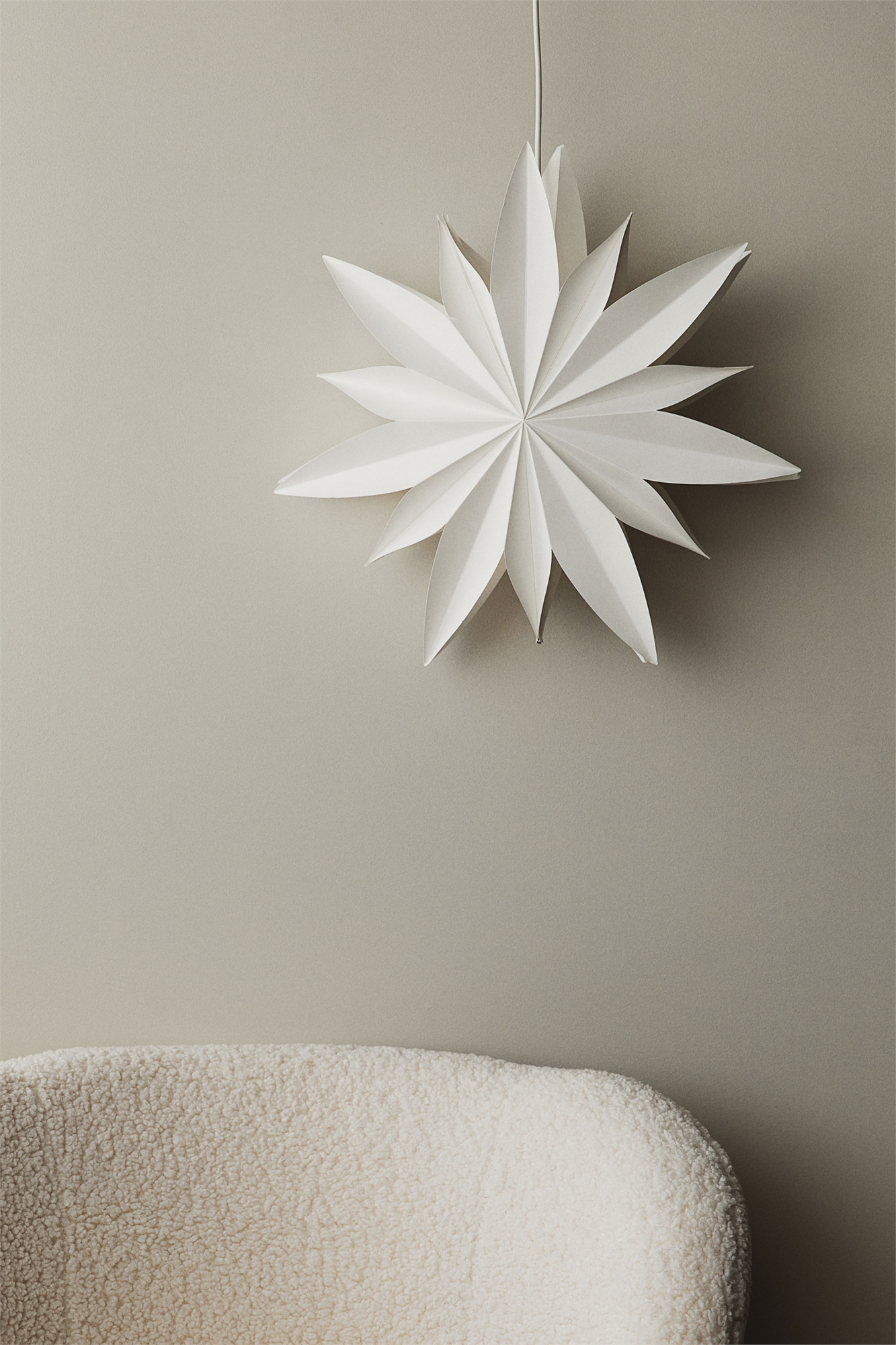 Абажур из бумаги в форме звезды. Диаметр 52 см. Шнур для подвешивания в комплект не входит. Рекомендуемый цоколь E14. Рекомендуемая лампочка 6W LED.