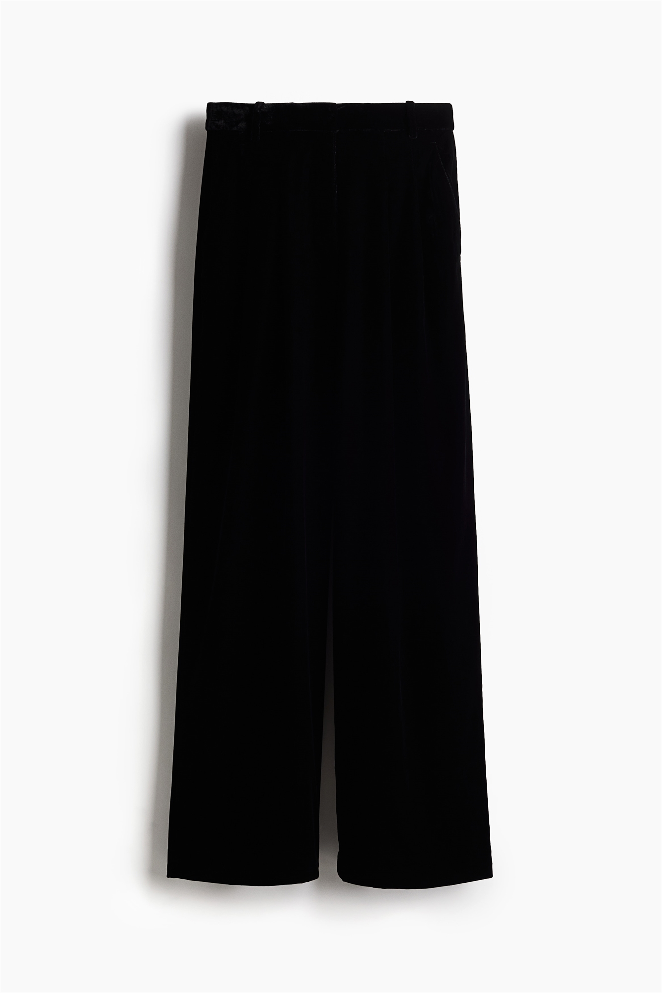Свободные брюки из мягкого бархата с высокой талией со скрытой эластичной резинкой, ширинкой на молнии и скрытой застежкой на пуговицы и крючки. Диагональные боковые карманы, втачные карманы сзади и широкие штанины со складками спереди.