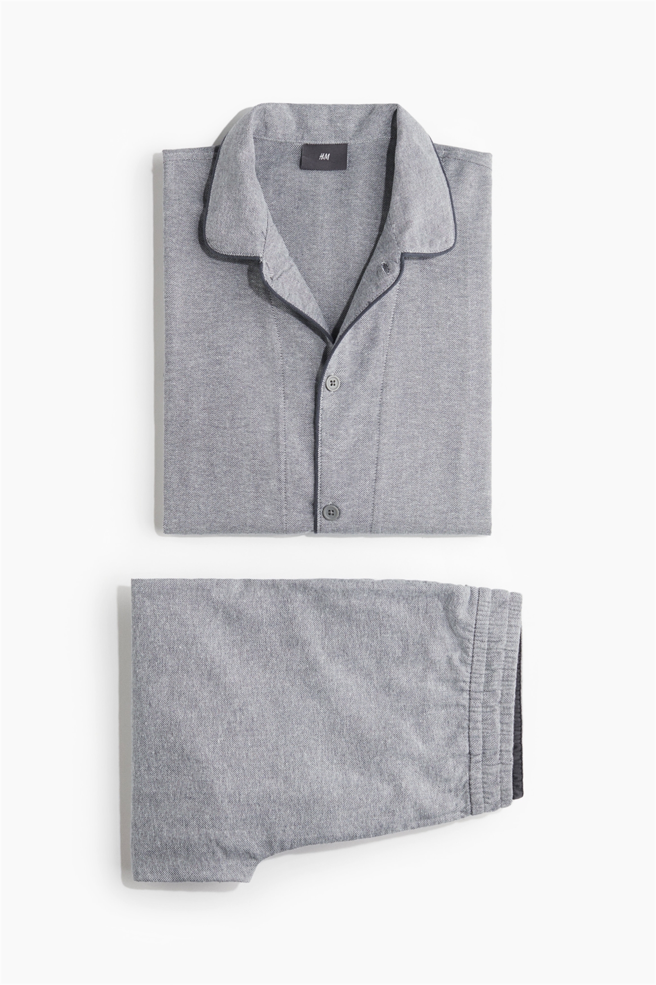 Пижама из мягкой хлопковой фланели. Рубашка с длинными рукавами, воротником, пуговицами спереди и накладными передними карманами. Подол прямого кроя с разрезом с каждой стороны. Низ с эластичной талией, фальшивой ширинкой и карманами в боковых швах.