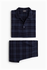Пижама из мягкой хлопковой фланели. Рубашка с длинными рукавами, воротником, пуговицами спереди и накладными передними карманами. Подол прямого кроя с разрезом с каждой стороны. Низ с эластичной талией, фальшивой ширинкой и карманами в боковых швах.