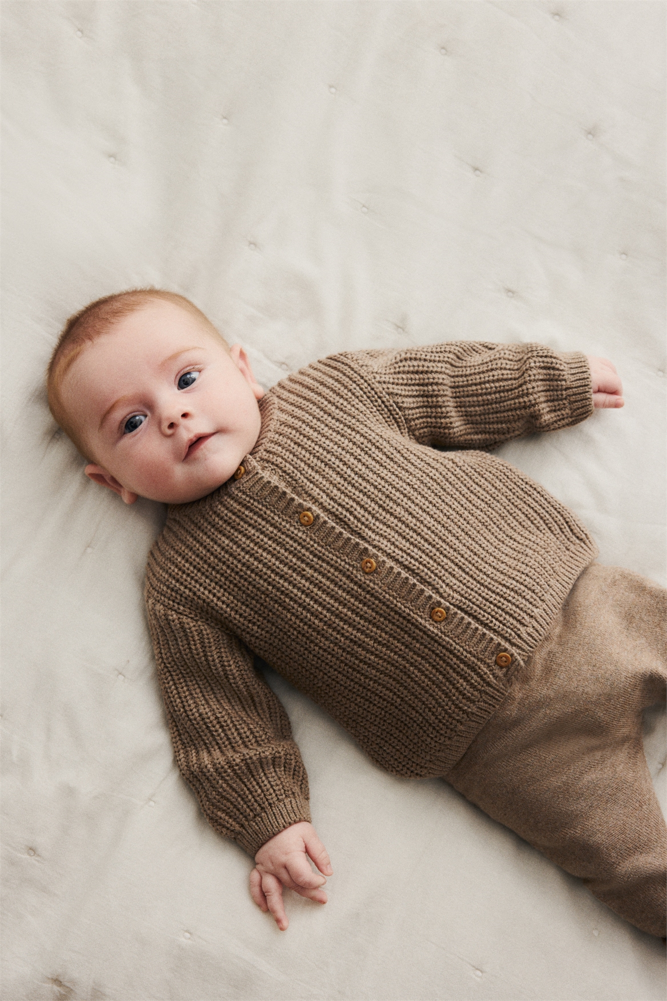 Комплект из кардигана и брюк из мягкого хлопкового трикотажа. Кардиган с круглым вырезом, пуговицами спереди и ребристыми манжетами и подолом. Брюки с эластичным поясом и ребристыми манжетами.