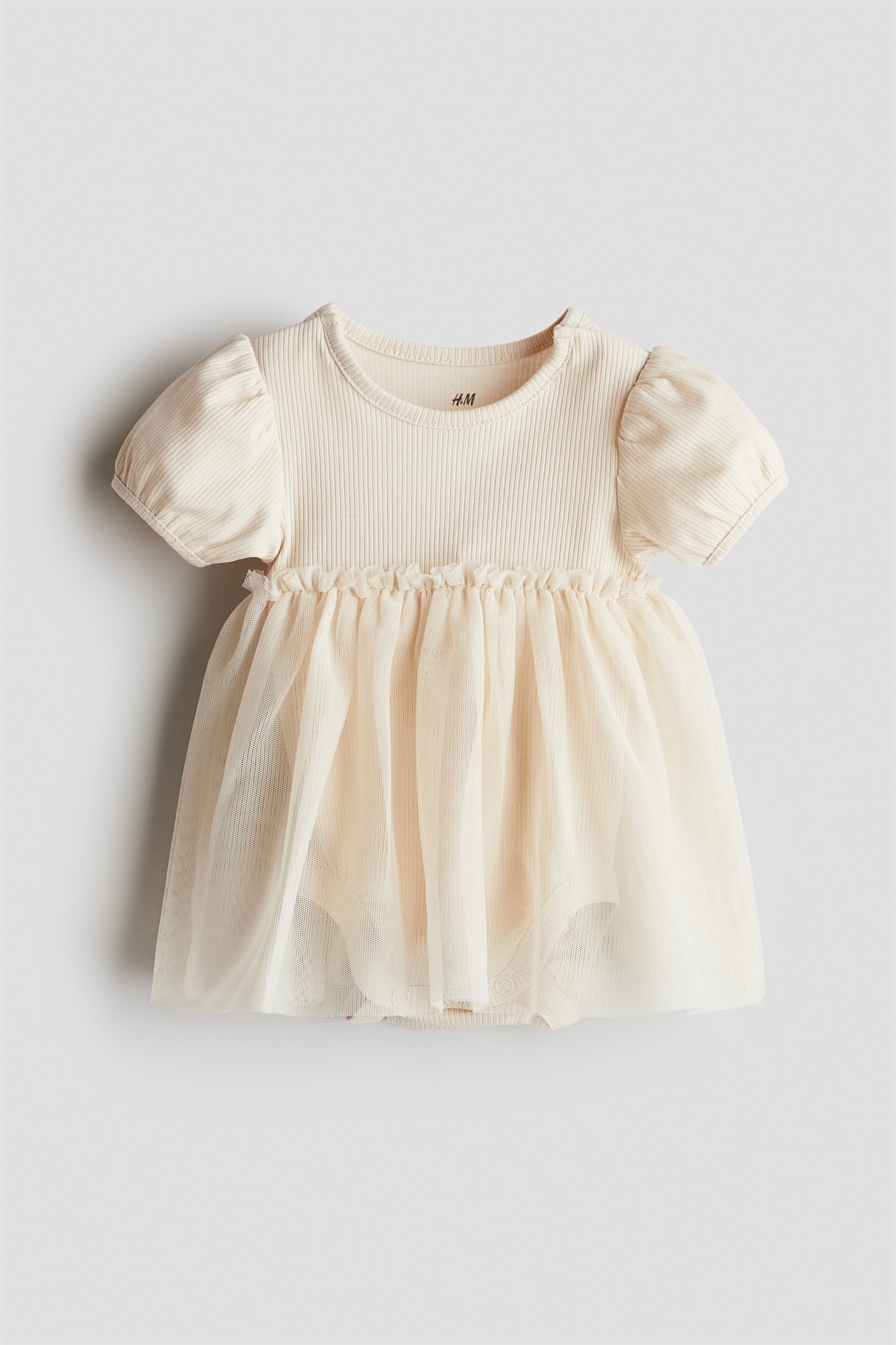 Платье с длинными рукавами из мягкого, ребристого хлопкового джерси с юбкой из тюля и пришитым боди-комбинезоном. Круглый вырез, застежка на кнопки по бокам, сборчатый шов на талии и расклешенная юбка. Боди-комбинезон с прижимами внизу и сборчатыми швами вокруг ножек для более удобного и плотного прилегания к подгузнику.